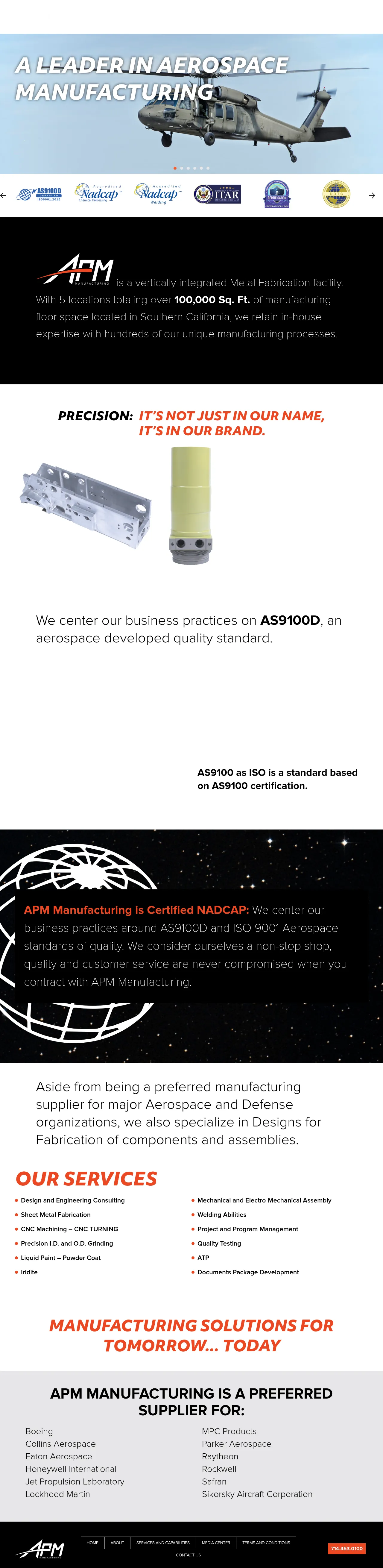 APM Manufacturing is a vertically integrated metal fabrication company operating five locations in Southern California. The firm provides design and development consultation plus fabrication of components and assemblies, with in-house capabilities across hundreds of manufacturing processes. With more than 30 years of industry experience, APM serves commercial markets such as telecommunications, construction and technology, as well as aerospace, military and industrial customers.