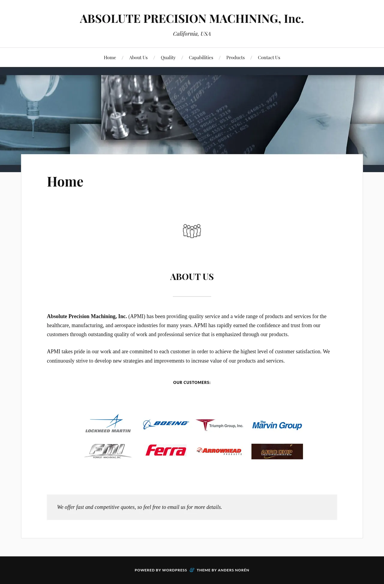 ABSOLUTE PRECISION MACHINING, Inc. is a California-based manufacturer specializing in precision machined components and assemblies. The company provides contract precision machining and production services with an emphasis on quality management and regulatory compliance. It holds ISO 9001:2015 and AS9100 certifications and offers competitive, responsive quoting for customer projects.