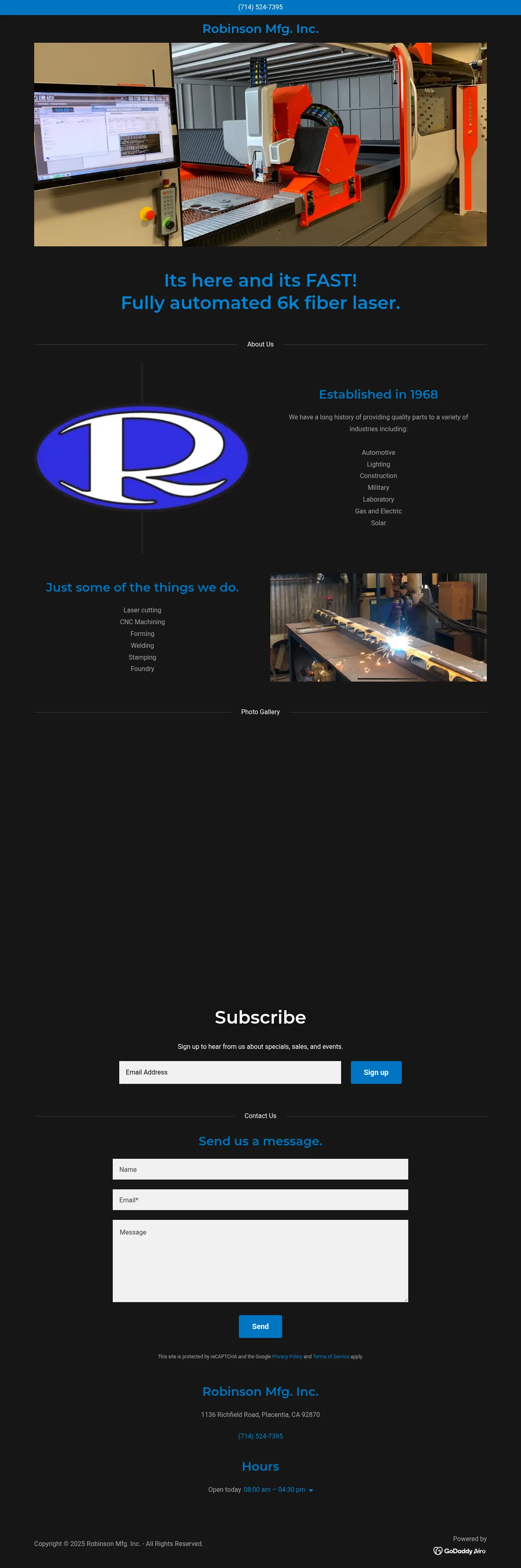 Established in 1968, Robinson Mfg. Inc. is a manufacturing company based in Placentia, California. The company provides metal fabrication services including laser cutting, forming, welding, stamping, foundry work and CNC machining. It serves a range of sectors such as automotive, lighting, construction, military, laboratory, gas and electric, and solar.