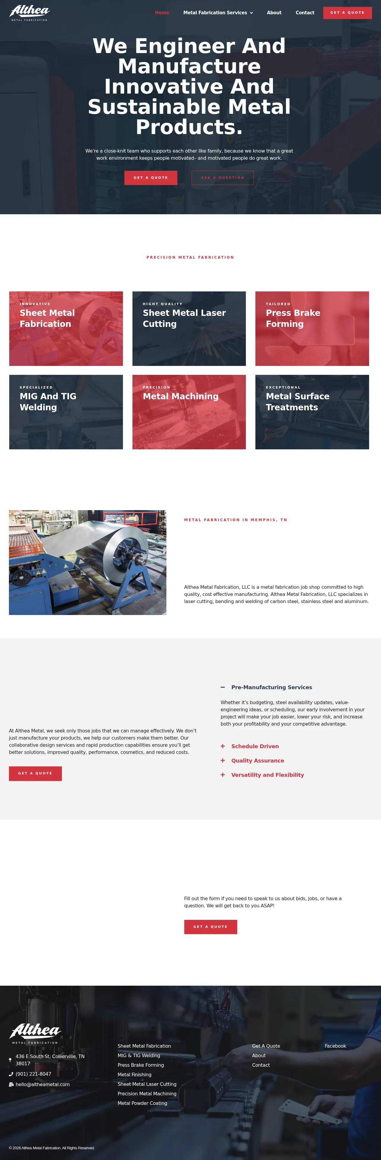 Althea Metal Fabrication, LLC is an industrial job shop based in Memphis, Tennessee, specializing in precision metal manufacturing and sustainable engineering solutions. The company provides a broad range of capabilities including sheet metal laser cutting, multi-axis press brake forming, and expert MIG and TIG welding. They offer comprehensive support from initial CAD design and prototyping to high-volume contract manufacturing and specialized finishing treatments. By focusing on schedule-driven project management and stringent quality control, Althea Metal Fabrication ensures reliable delivery for complex components. Their collaborative approach includes value engineering to optimize product performance and reduce production costs for diverse industrial applications.
