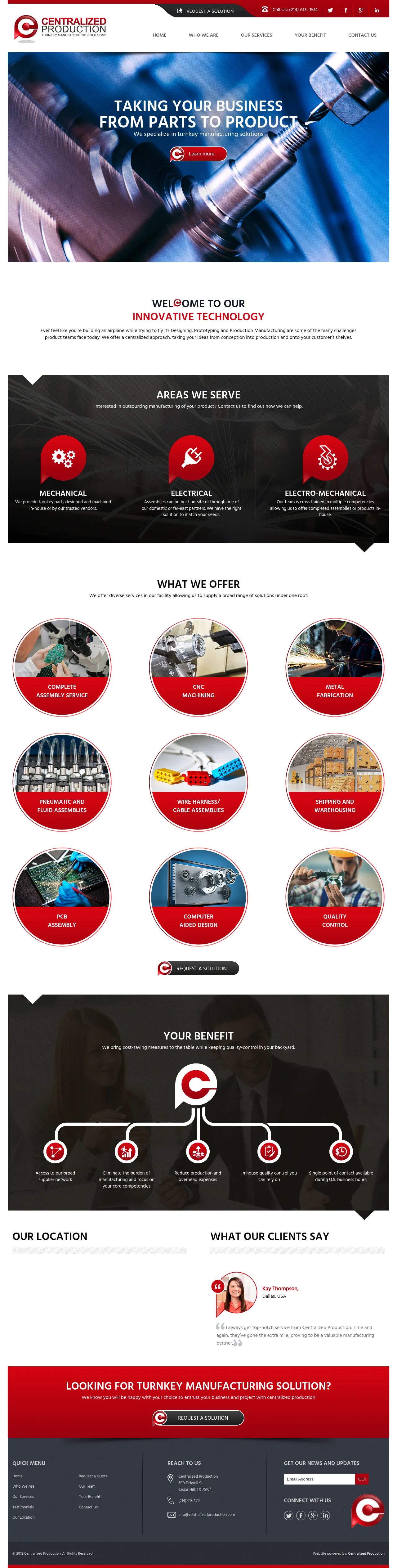 Centralized Production provides comprehensive turnkey manufacturing services designed to support product development from initial conception through to final delivery. The company manages the entire production lifecycle, including design, prototyping, and assembly, allowing clients to outsource manufacturing while maintaining localized quality control. They serve a broad range of sectors, including mechanical and electro-mechanical industries. By utilizing a wide supplier network, the firm focuses on reducing overhead costs and streamlining production workflows. Their facility in Cedar Hill, Texas, functions as a centralized hub for engineering, fabrication, and logistics.