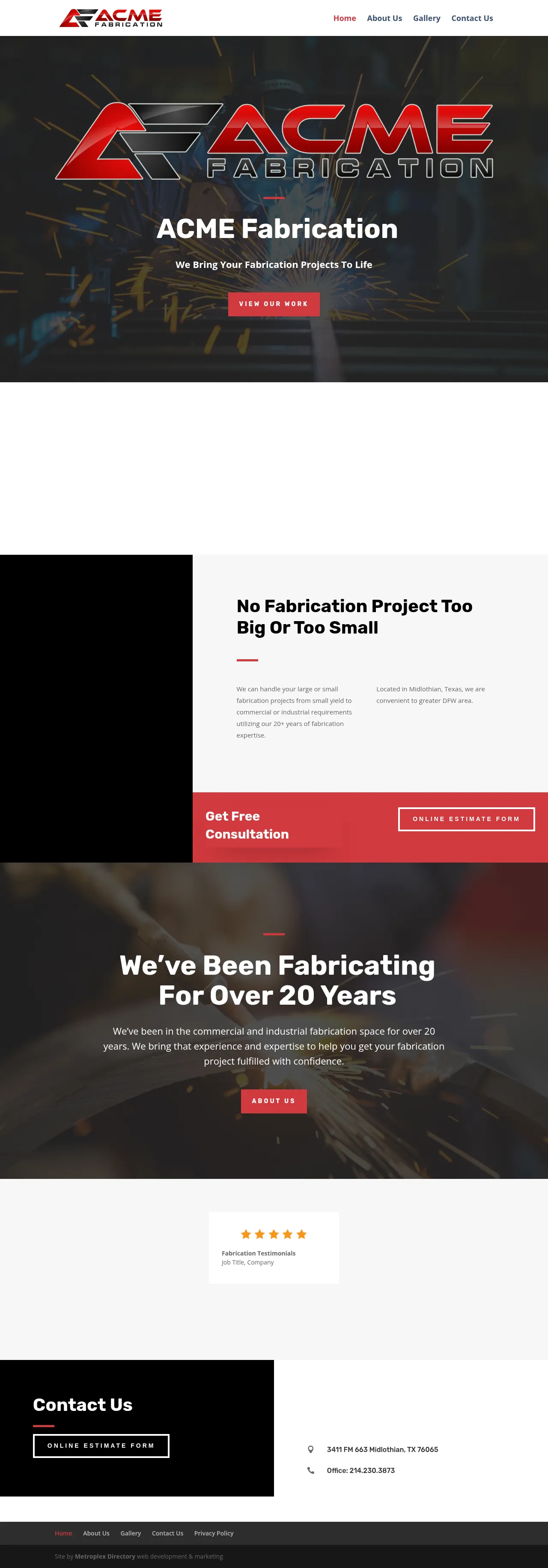 ACME Fabrication is a metal manufacturing facility based in Midlothian, Texas, serving the greater Dallas-Fort Worth area. With over two decades of experience, the company provides custom metal fabrication solutions for commercial and industrial projects of varying scales. Their service capabilities include specialized metal cutting and forming processes tailored to meet precision requirements. The company emphasizes quality through the use of durable materials and backs their workmanship with an industry-leading warranty. They accommodate a diverse range of project needs, from small-scale prototyping to large-scale industrial fabrication.