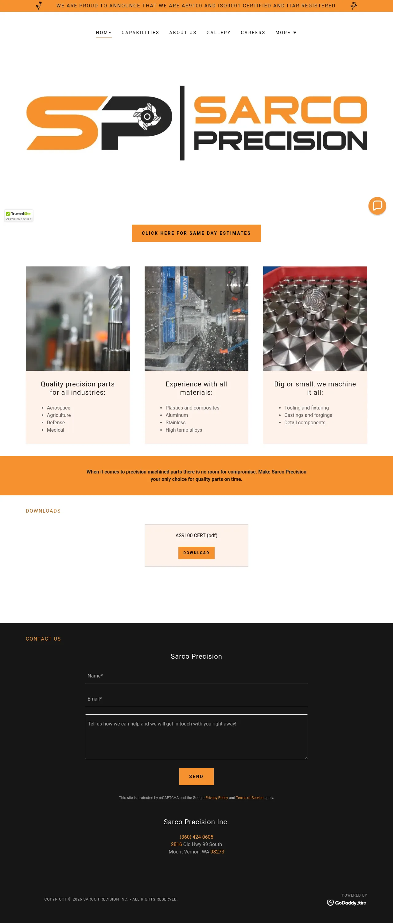 Sarco Precision Inc. is a precision machine shop providing high-quality manufacturing services for the aerospace, agriculture, defense, and medical industries. The company specializes in tooling, fixturing, component assembly, and complex precision machining. With robust internal quality processes, they offer services including reverse engineering and detailed inspection. Sarco Precision maintains a strong commitment to quality standards and delivers reliable, on-time manufacturing solutions for various technical applications.