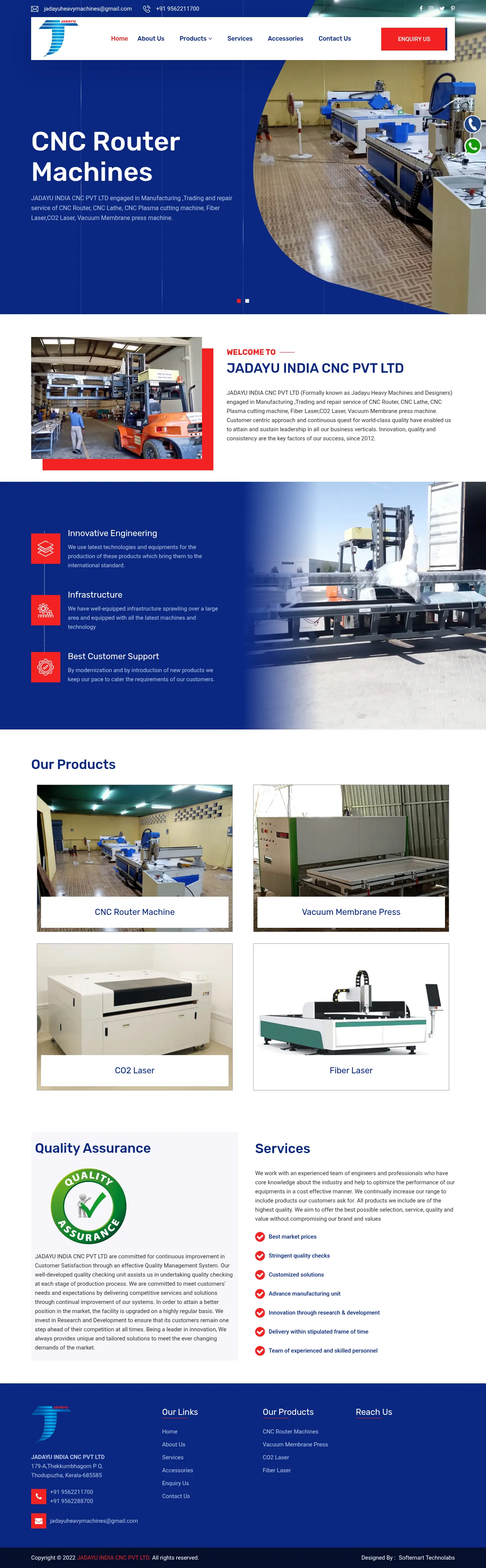 JADAYU INDIA CNC PVT LTD manufactures, trades and services CNC machinery including routers, lathes, plasma cutting machines, CO2 and fiber laser systems, and vacuum membrane presses. The company offers repair and maintenance services as well as custom machine solutions. Founded in 2012 (formerly Jadayu Heavy Machines and Designers), it emphasizes quality control, research and development, and regular facility upgrades to meet customer requirements.