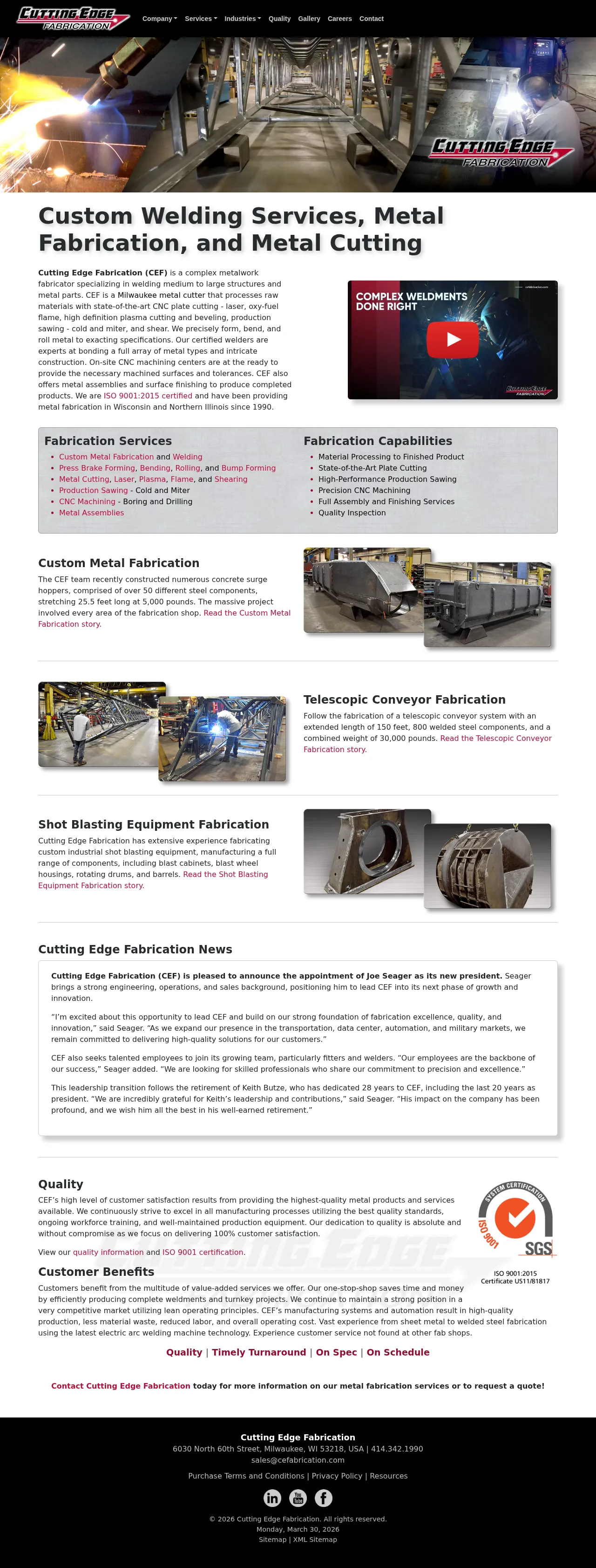 Cutting Edge Fabrication is a full-service metal fabrication company based in Milwaukee, Wisconsin, specializing in the production of medium to large metal structures and assemblies. The company provides a comprehensive suite of services including laser, plasma, and oxy-fuel plate cutting, precision CNC machining, press brake forming, and robotic welding. Serving diverse sectors such as aerospace, military, construction, and food processing, they manage projects from raw material procurement to finished product assembly. With over three decades of experience, the facility is equipped to handle large-scale components weighing up to 10,000 pounds and measuring up to 60 feet in length. The organization emphasizes lean manufacturing principles and maintains strict quality control systems to ensure precision and customer satisfaction.