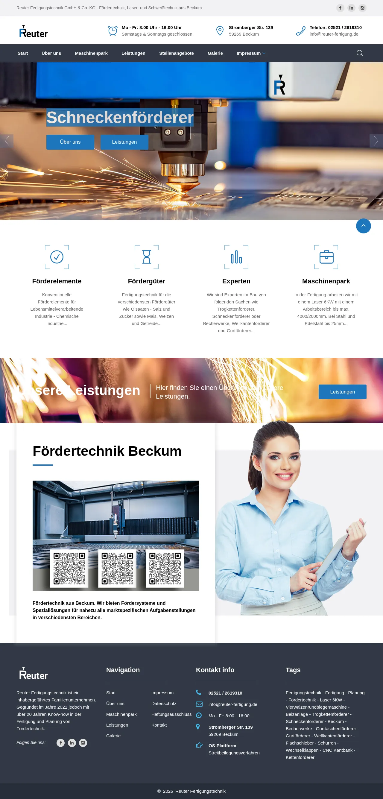 Reuter Fertigungstechnik is a family-owned manufacturing company based in Beckum, Germany, specializing in the design and production of industrial conveyor systems. With over two decades of expertise, the firm delivers tailored solutions for sectors including food processing, agriculture, and the chemical industry. Their product range features trough chain conveyors, screw conveyors, bucket elevators, and belt systems designed to handle diverse materials such as grains, oilseeds, salt, and sugar. The company provides end-to-end services ranging from initial planning to precision metal manufacturing. Utilizing advanced laser and bending technologies, they supply robust mechanical components and specialized conveying equipment to meet specific client requirements.