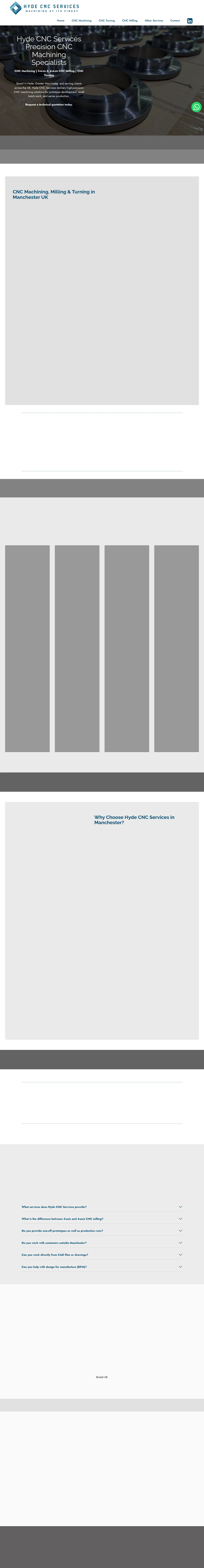 Hyde CNC Services is a precision engineering company in Hyde, Greater Manchester, providing advanced CNC machining for clients across the UK. The business specialises in high-accuracy 3-axis and 4-axis milling and precision CNC turning, supporting work from single prototypes to small and medium production batches. It offers engineering support from concept or CAD through to finished parts and operates under ISO 9001 quality management principles to ensure consistent, repeatable results.