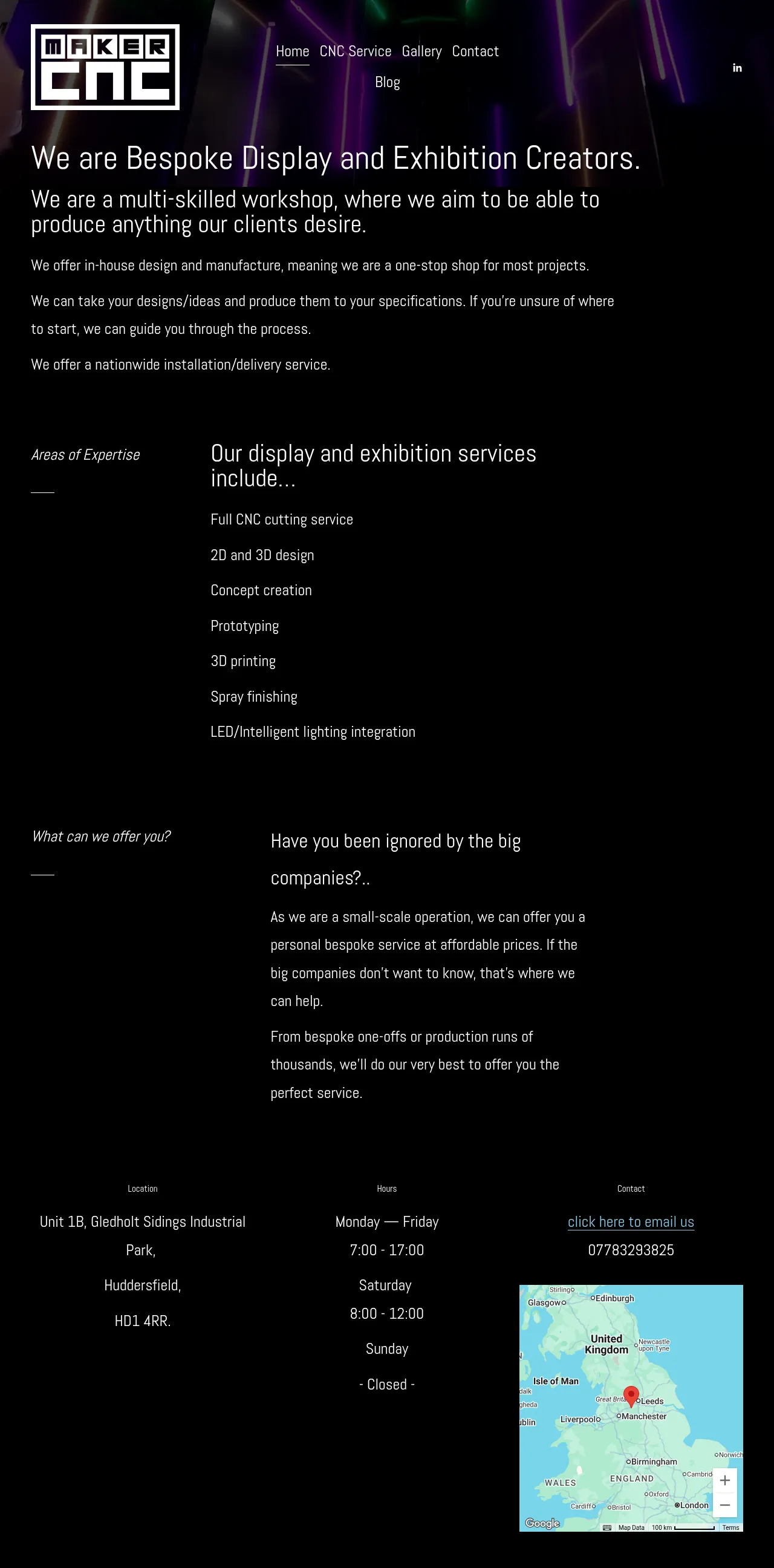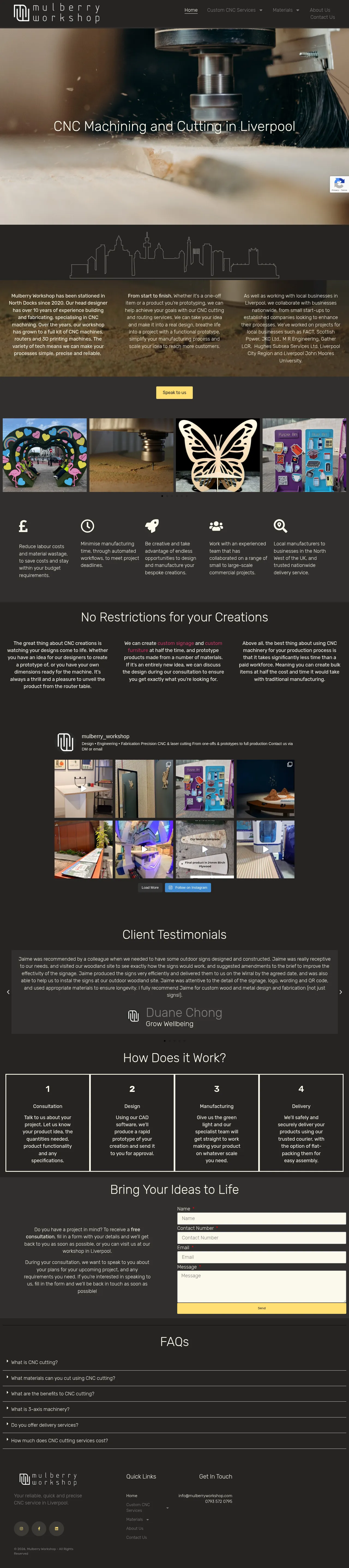 Mulberry Workshop is a Liverpool-based CNC machining and cutting company that supplies custom signage, props, and precision-cut components for businesses of various sizes. The shop provides CNC cutting for aluminum, a range of plastics, and foam for protective inserts, signage, props, and insulation. Projects are produced to customer specifications with services covering bespoke signage fabrication and prop production.