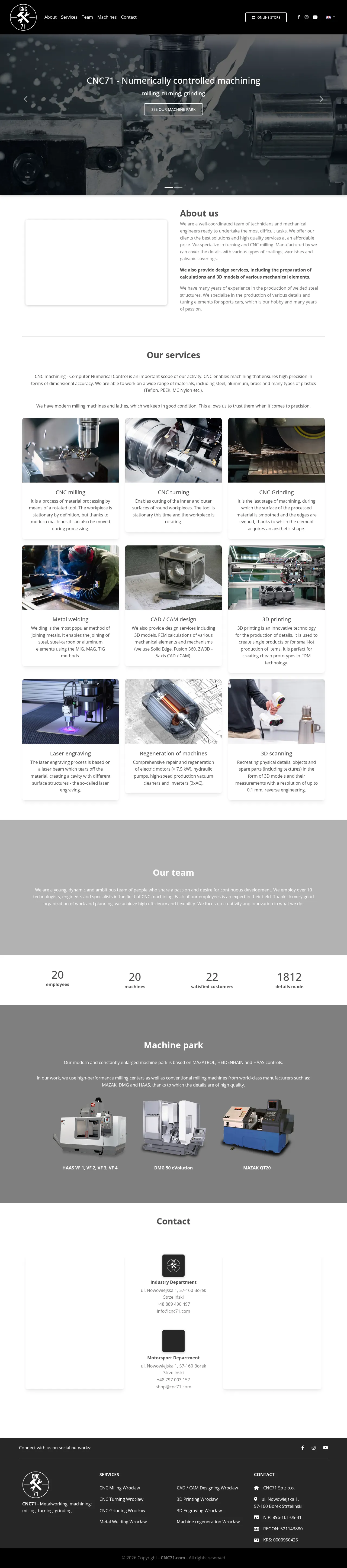 CNC71 is a specialized manufacturing company based in Wrocław, Poland, focused on high-precision CNC machining and welded steel structures. The company provides a comprehensive suite of services including milling, turning, grinding, and 3D printing for various mechanical components. They possess extensive expertise in the automotive sector, specifically in producing tuning elements and custom performance parts. Beyond machining, CNC71 offers design and engineering support through CAD/CAM software, FEM calculations, and 3D scanning. Their facility is equipped with modern high-performance centers capable of handling complex projects from prototyping to small-lot production.