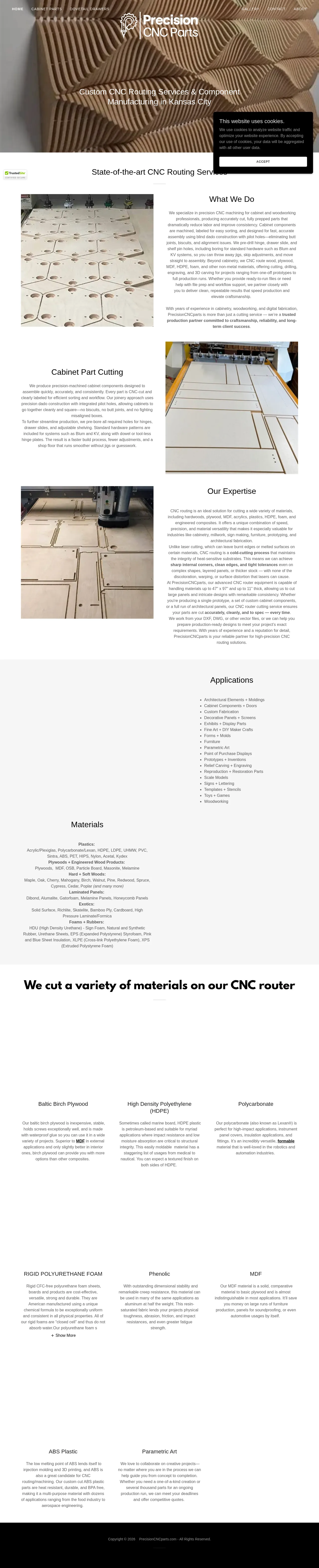 PrecisionCNCparts is a Kansas City-based fabrication shop specializing in CNC routing and component manufacturing for cabinetry, woodworking, and architectural projects. The company produces CNC-cut, labeled cabinet components with pre-bored hardware holes and precision joinery to streamline assembly. Services include cutting, drilling, engraving, 3D carving, edge banding, dovetail drawer production, and both prototype and production runs. They also offer file-prep and workflow support and can work from customer DXF/DWG/vector files.