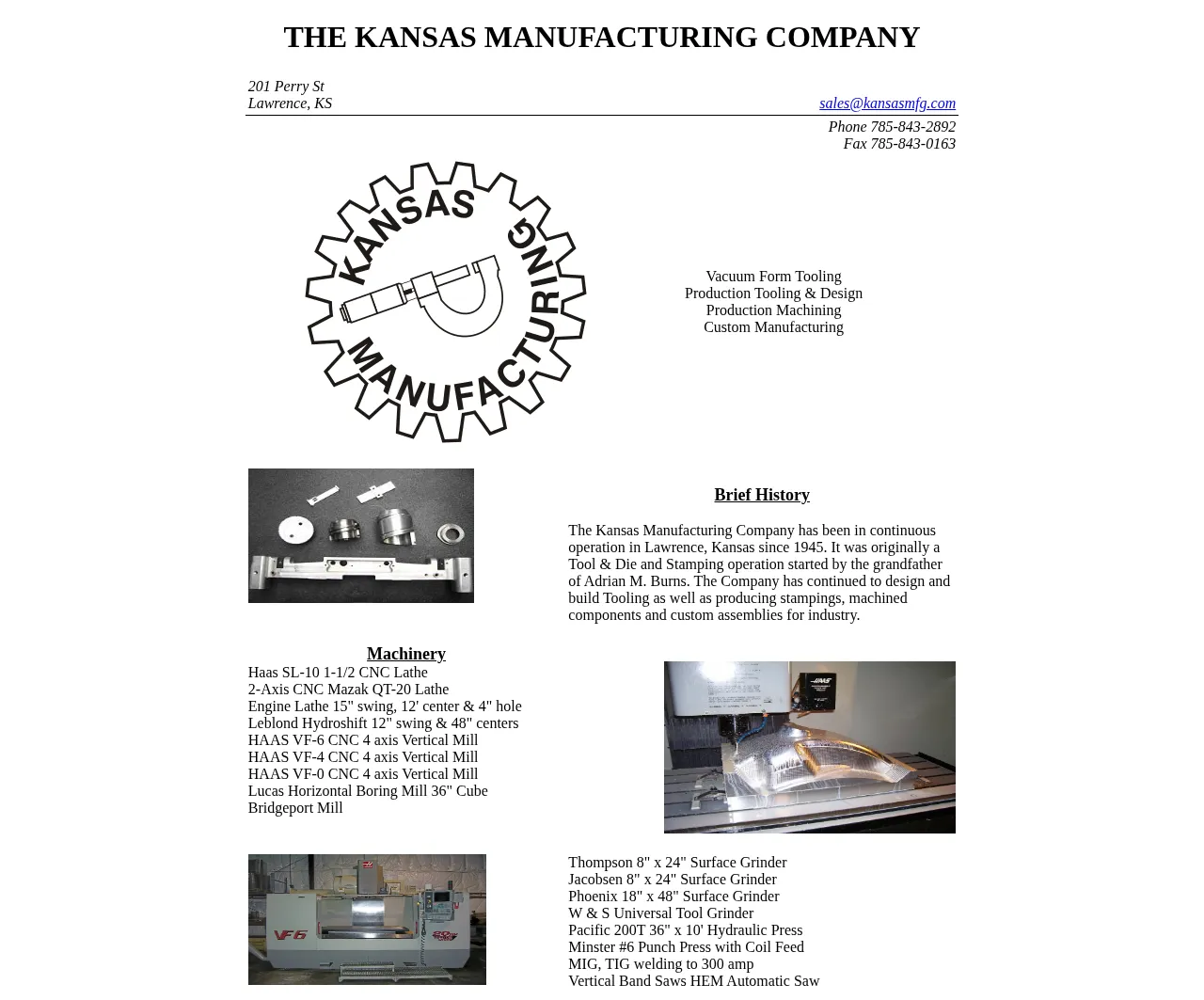 The Kansas Manufacturing Company has operated in Lawrence, Kansas since 1945. Originally established as a tool-and-die and stamping shop, the company continues to design and build tooling and produce stampings, machined components, and custom assemblies. It provides production tooling and machining services for industrial customers.