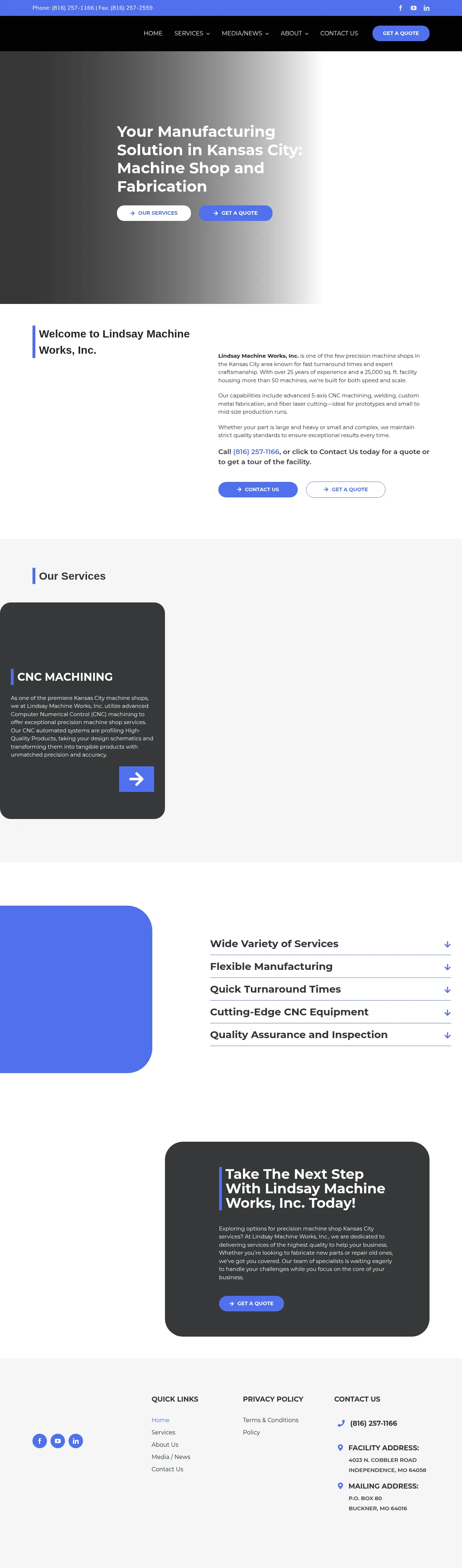 Lindsay Machine Works is a metal fabrication and machining company based in Independence, Missouri. The company provides CNC machining, fiber laser cutting, CNC plasma cutting, waterjet cutting, welding, bending, and assembly services for manufacturers, fabricators, and OEMs. They handle projects requiring precision, tight tolerances, and fast turnaround across a range of plate thicknesses and complex shapes.