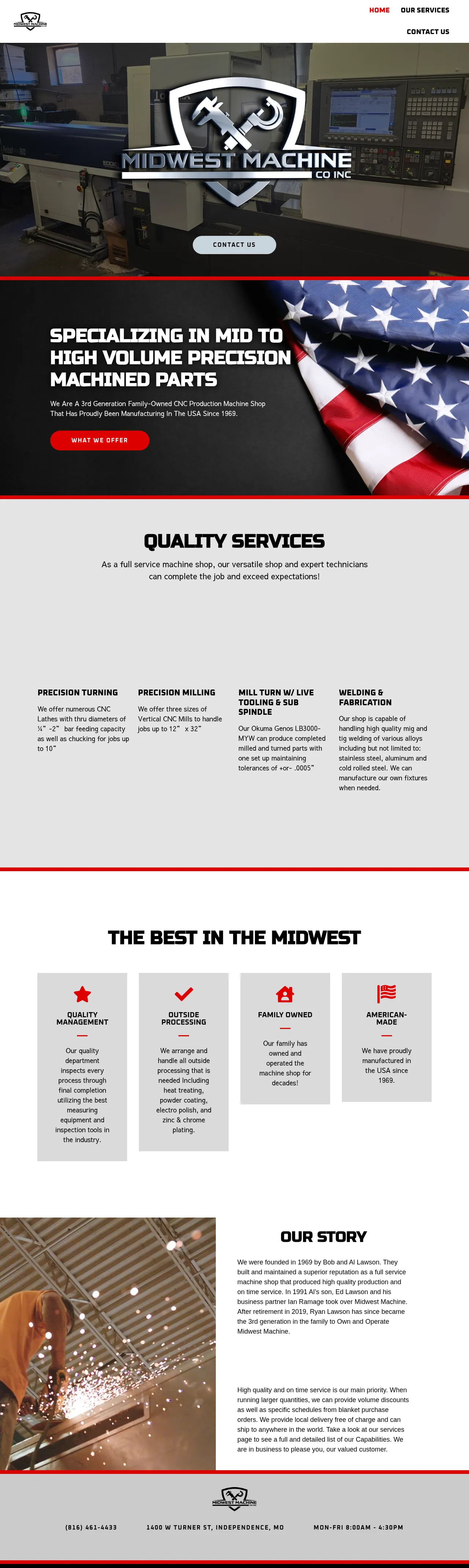 Midwest Machine is a third‑generation, family‑owned CNC production machine shop manufacturing in the United States since 1969. The company produces mid- to high-volume precision machined parts and provides machining, welding, and fabrication services. It also manages quality inspection and coordinates outside processing such as heat treating and plating.