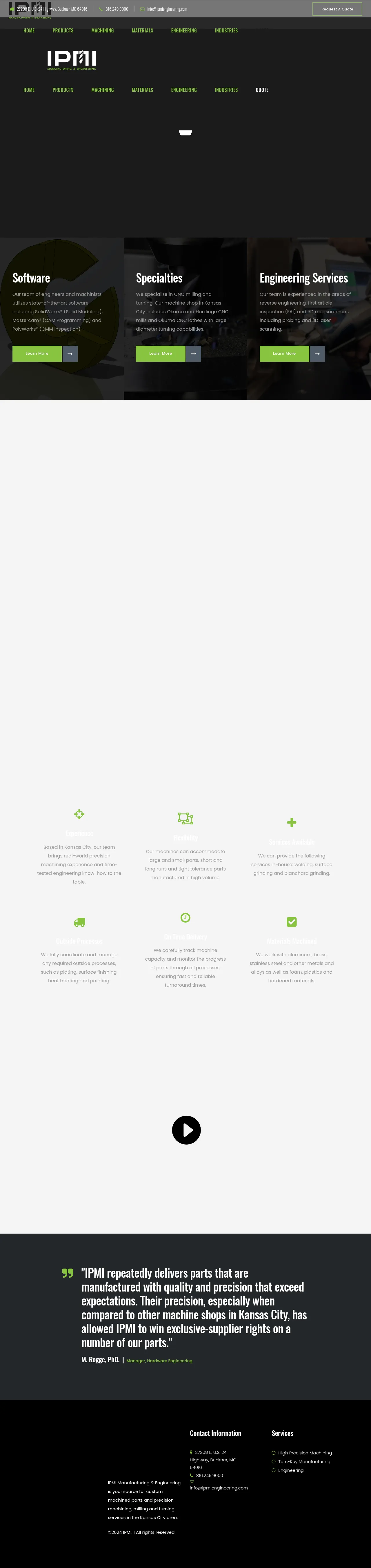IPMI Manufacturing & Engineering is a precision CNC machine shop serving the Kansas City area. The company delivers custom milled and turned components and provides end-to-end manufacturing from concept and prototyping through high-volume production. Engineering capabilities include reverse engineering, first article inspection (FAI) and 3D measurement and scanning. IPMI performs in-house welding and grinding and coordinates external processes such as plating, heat treating and painting.