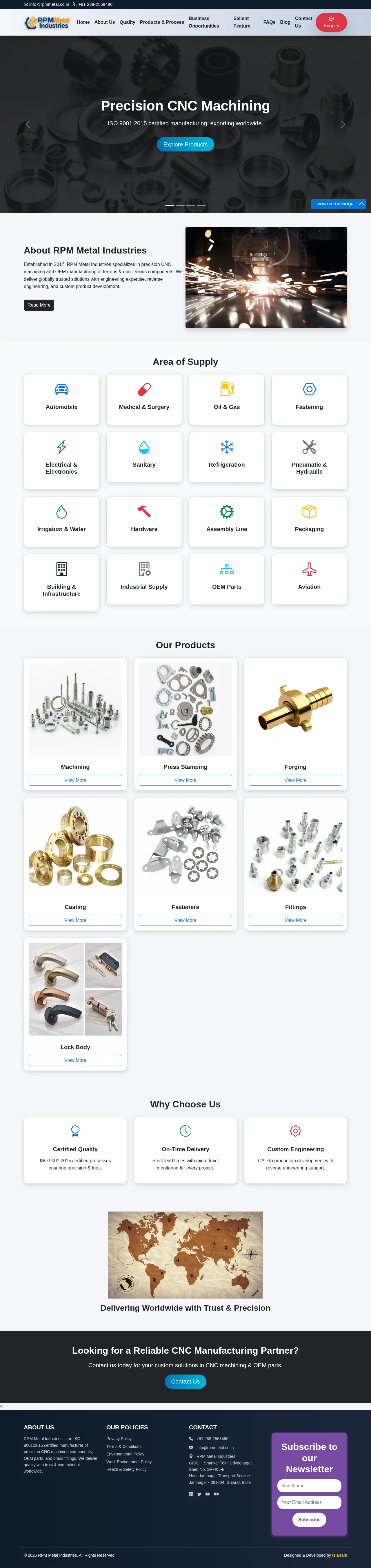 Founded in 2017, RPM Metal Industries is an ISO 9001:2015 certified manufacturer of precision CNC machined components, OEM parts and brass fittings. The company provides machining, stamping, forging and casting services and supplies components worldwide across automotive, electrical, refrigeration, irrigation and infrastructure sectors. It also offers CAD-to-production development, reverse engineering and assembly services for custom metal parts.
