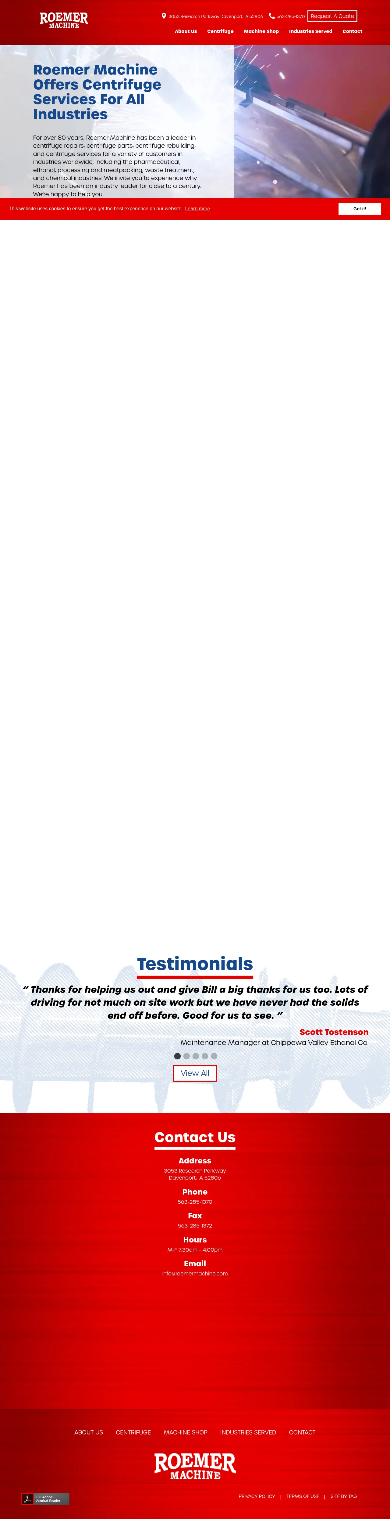 Roemer Machine is an industrial manufacturing company based in Davenport, Iowa, specializing in centrifuge repair, rebuilding, and maintenance. Established in 1940, the company serves diverse global sectors, including the pharmaceutical, ethanol, chemical, and meatpacking industries. Their capabilities encompass full-spectrum machining, ranging from small precision components to large-scale parts. With nearly a century of experience, they provide custom fabrication and welding services supported by a highly skilled engineering and machine shop team. The company is dedicated to providing high-quality machine work, custom project solutions, and reliable mechanical support.