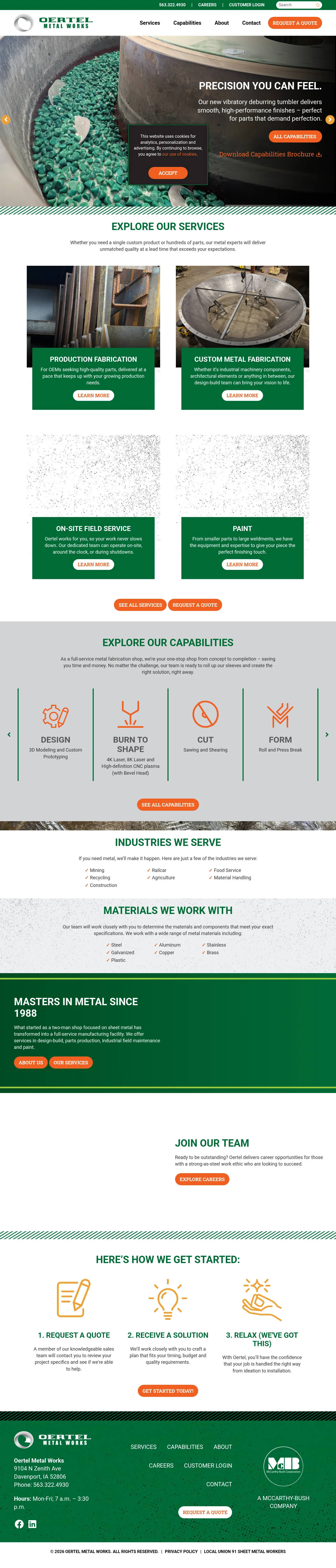 Oertel Metal Works is a full-service metal fabrication and manufacturing facility based in Davenport, Iowa. Founded in 1988, the company provides turnkey solutions including design-build, precision parts production, industrial field maintenance, and professional finishing services. They serve a diverse range of industries such as mining, construction, agriculture, and material handling. The company utilizes advanced manufacturing techniques to handle projects ranging from single prototypes to large-scale production runs. By integrating design, welding, machining, and assembly, they provide a streamlined manufacturing experience focused on quality and lead-time efficiency.
