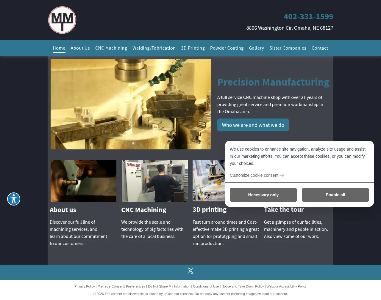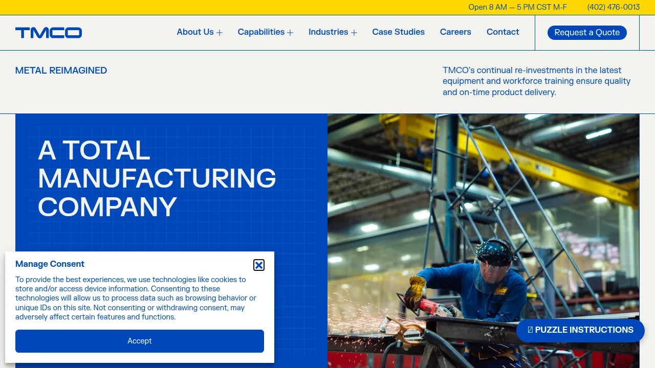 TMCO is a metal fabrication and machining company based in Lincoln, Nebraska. The company provides CNC turning and milling, multi-axis machining, laser and waterjet cutting, tube laser processing, robotic grinding, and welding services. TMCO serves customers requiring complex part production and sheet metal fabrication, with in-house capabilities from cutting through welding and finishing.