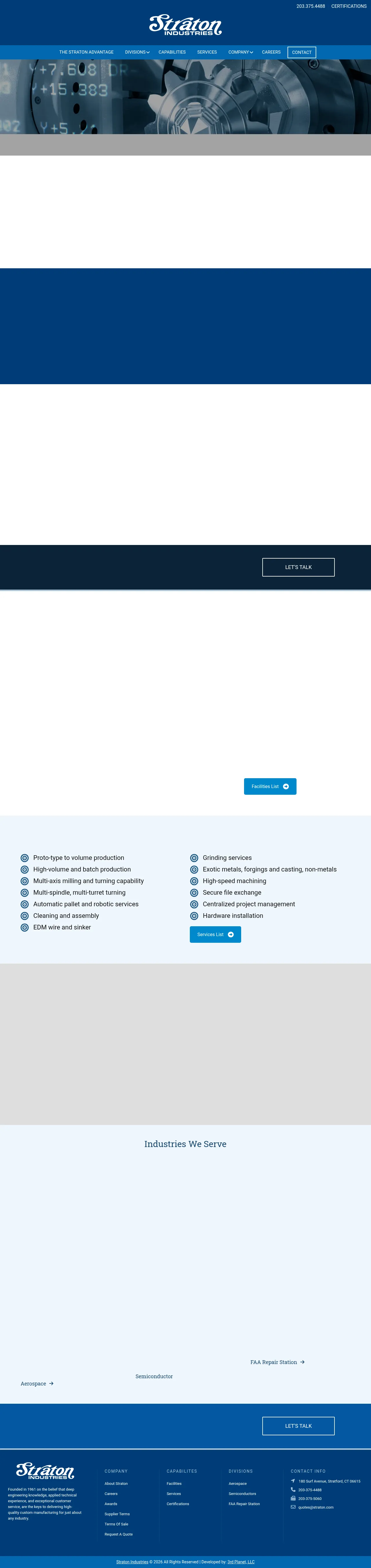 Straton Industries is a full-service contract manufacturer providing precision machining, assembly, and engineering solutions. The company serves the aerospace, defense, and semiconductor industries with capabilities including multi-axis CNC machining, EDM, grinding, and welding. Operating as an FAA-certified repair station, they specialize in handling exotic metals and complex geometries for both prototype and high-volume production. Their facility utilizes advanced technology such as Model Based Definition (MBD) and lights-out manufacturing to ensure efficiency and quality control throughout the production lifecycle.