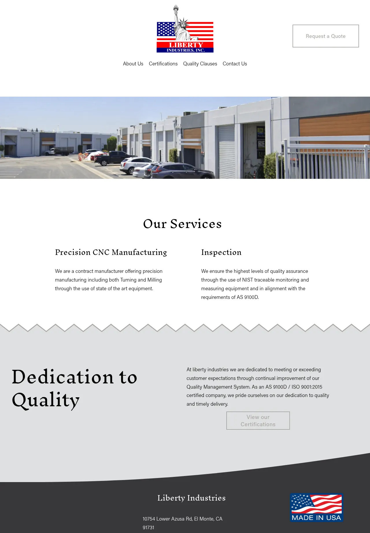 Liberty Industries is a contract manufacturing firm specializing in precision CNC machining services. The company provides high-quality turning and milling solutions to support diverse industrial manufacturing requirements. They operate under a rigorous quality management system to ensure precision and accuracy in all production processes. With a focus on technical excellence, the firm utilizes NIST-traceable measurement equipment for comprehensive quality assurance. Their operations are aligned with aerospace-grade quality standards to serve clients requiring consistent, reliable output.
