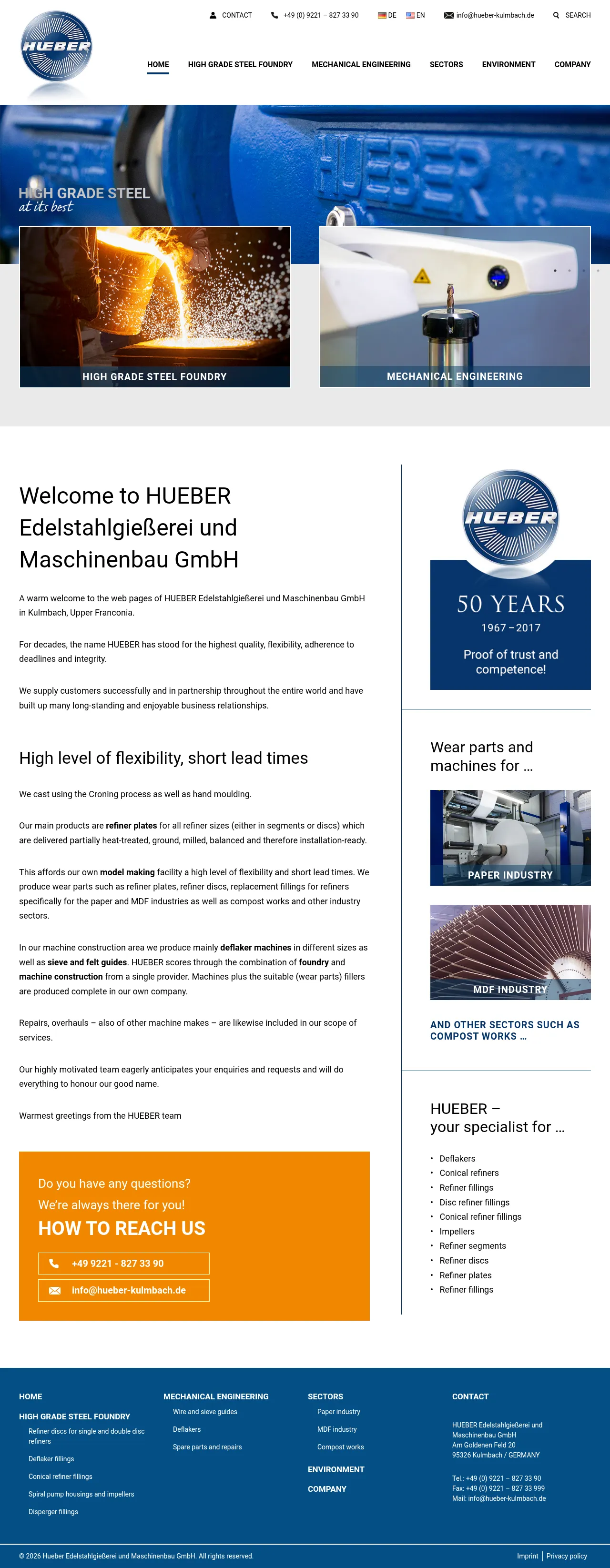 HUEBER Edelstahlgießerei und Maschinenbau GmbH is a specialized manufacturer and foundry based in Kulmbach, Germany. The company produces precision cast wear parts and mechanical components for the paper, MDF, wood processing, and environmental engineering industries. Their core capabilities include stainless steel foundry operations utilizing Croning and hand moulding processes, complemented by in-house machine construction. HUEBER provides custom refiner plates, segments, pump housings, and complete machine solutions, emphasizing high material quality, short lead times, and technical support. They serve a global client base with a focus on custom manufacturing and professional technical consulting.