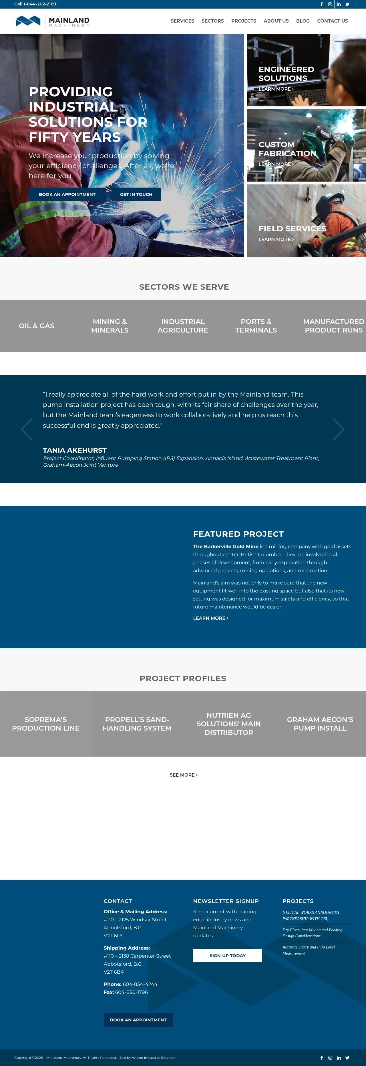 Mainland Machinery provides comprehensive industrial engineering, custom fabrication, and field services to clients throughout British Columbia and Alberta. The company supports a wide range of sectors, including agriculture, water treatment, forestry, and food production, by managing projects from initial design through to final installation. Their internal capabilities include manufacturing custom conveyors, hoppers, silos, and tanks designed for improved operational safety and efficiency. Acting as an extension of their clients' teams, they emphasize a collaborative approach to solving complex mechanical challenges and maintaining industrial infrastructure. They have established a strong reputation for delivering turn-key solutions that optimize production workflows and equipment performance.