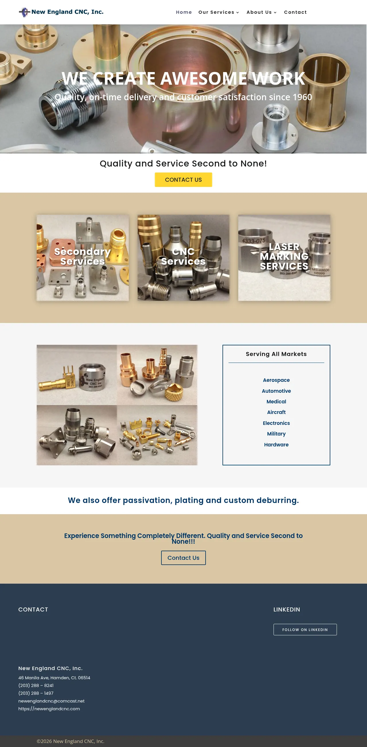 New England CNC, Inc. is a precision manufacturing facility established in 1960, specializing in CNC machining and comprehensive secondary operations. The company serves a diverse range of global industries including aerospace, automotive, medical, and military sectors. Core capabilities include CNC turning and milling, multi-axis machining, and advanced laser marking for permanent product branding. The 7,500-square-foot Hamden, Connecticut facility is equipped to handle both prototype development and long-run production assignments. Their production process integrates specialized finishing services such as passivation, plating, and deburring to provide complete, ready-to-use machined components.