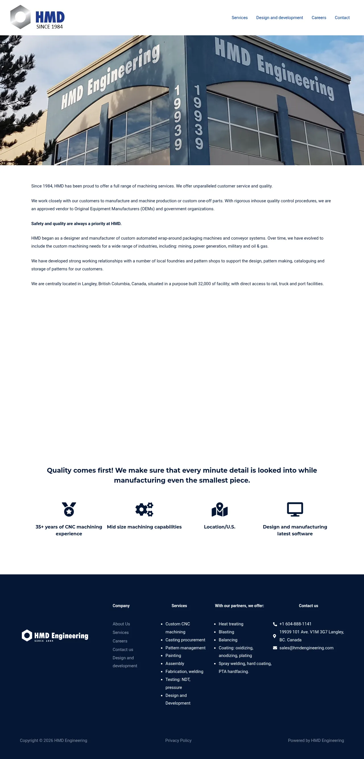 HMD Engineering is a specialized manufacturer based in Langley, British Columbia, providing precise CNC machining and fabrication services. With over 35 years of experience, the company focuses on handling complex medium to large-scale parts for the mining, power generation, marine, and military industries. Their facility is equipped for a wide range of secondary processes, including casting procurement, pattern management, heat treating, and protective coating applications. The team utilizes advanced 3D CAD/CAM software for design, prototyping, and reverse engineering to deliver high-quality, reliable solutions. Their operational strategy emphasizes rigorous inspection procedures and analytical planning to ensure parts are manufactured accurately to specification.