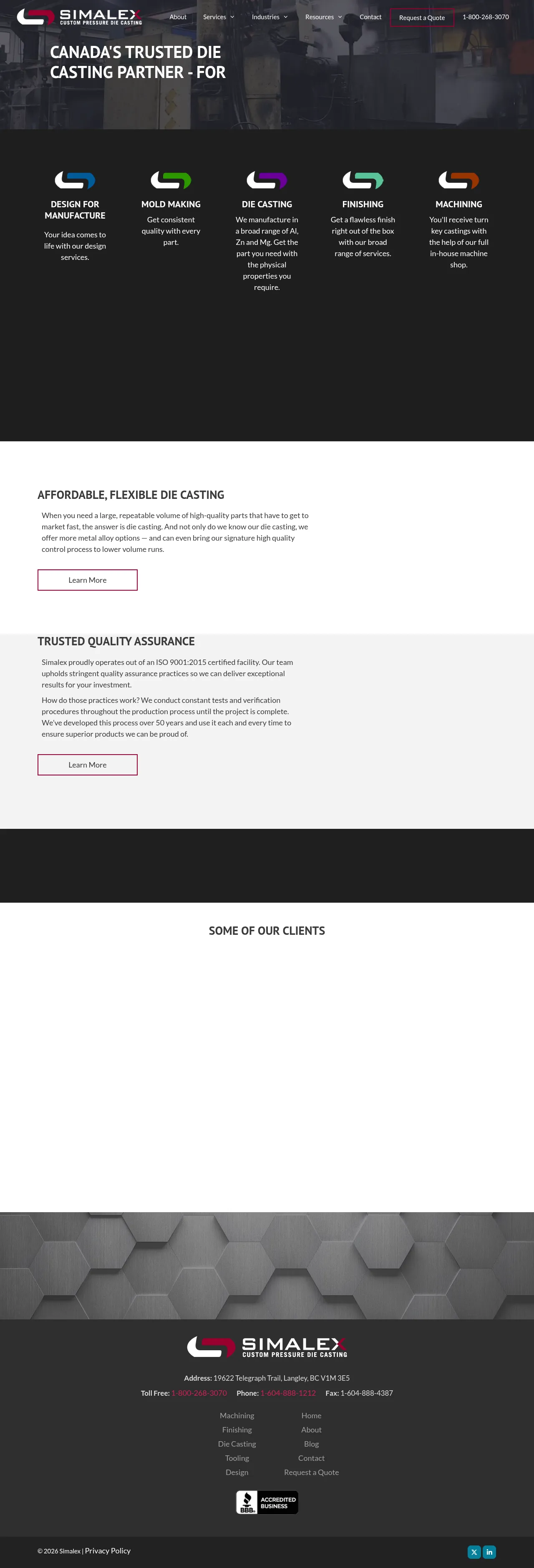 Simalex Manufacturing is a Canadian die casting firm based in Langley, British Columbia, specializing in high-pressure die casting for North American industrial clients. The company provides a comprehensive suite of services including design for manufacturability, custom tooling, secondary machining, and finishing. They support a diverse range of sectors, including medical, telecommunications, railway, and heavy industrial applications. With over 50 years of experience, the company maintains a focus on consistent quality through rigorous testing and verification procedures. They are committed to resilient supply chain management and offer solutions for both high-volume and specialized production runs.