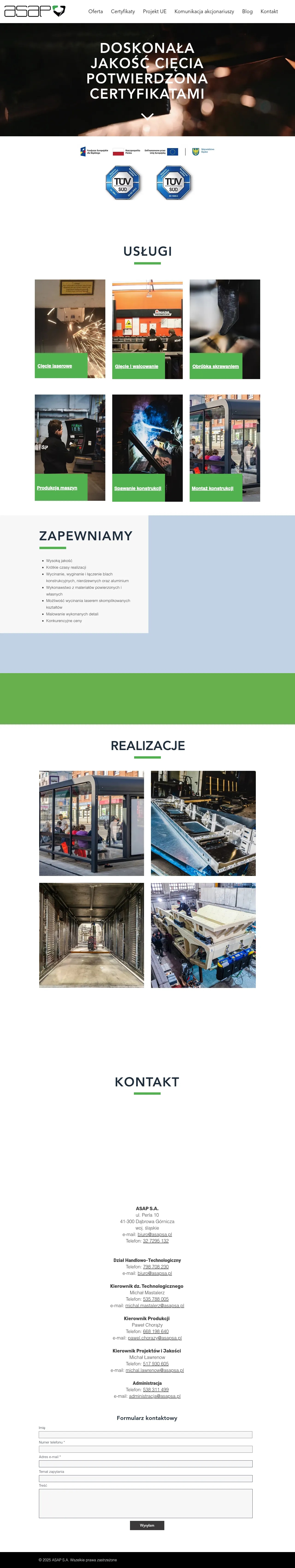 ASAP S.A. is an industrial manufacturing company based in Dąbrowa Górnicza, specializing in complex sheet metal, stainless steel, and aluminum processing. The firm provides comprehensive metalworking services including laser cutting, CNC machining, bending, rolling, and structural welding. Their products are utilized across diverse sectors such as electronics, automation, electromedicine, automotive, and control-measurement instrumentation. The company operates according to ISO 9001 standards and maintains rigorous quality control processes for all custom components. ASAP S.A. is equipped to handle projects from both provided documentation and customer-supplied samples.