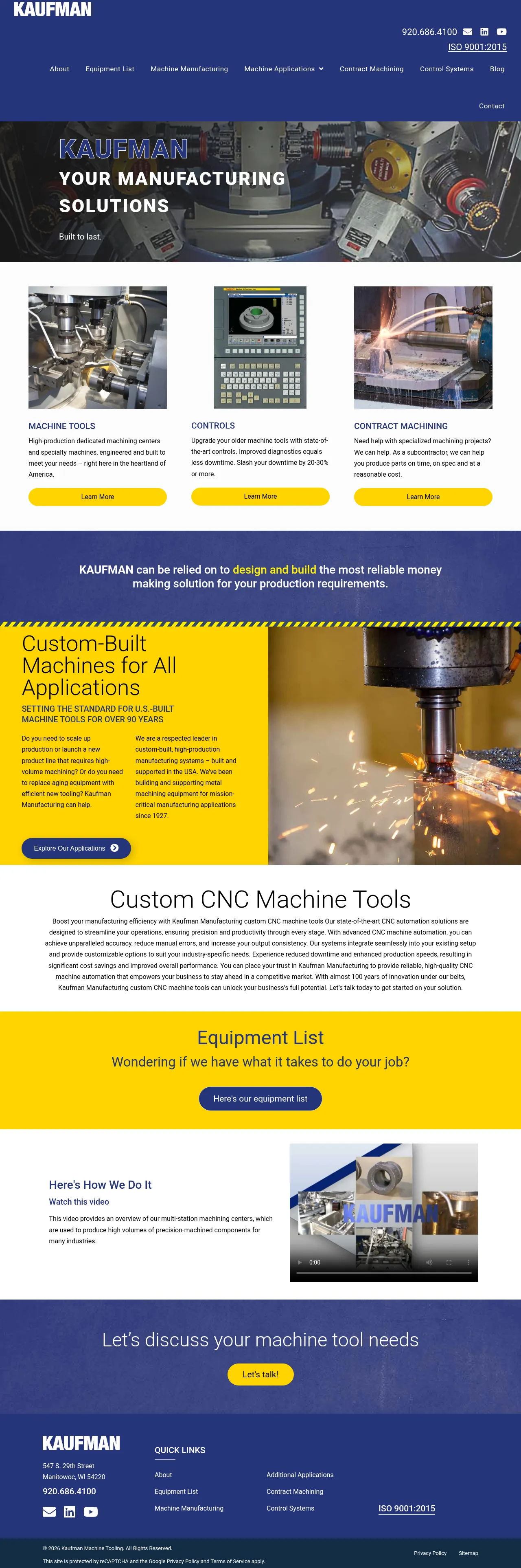 Kaufman Manufacturing specializes in the design, engineering, and construction of custom high-production CNC machine tools and rotary transfer systems. Established in 1927, the company provides turnkey machining solutions including contract manufacturing for the automotive, hydraulic, and heavy equipment industries. Their services encompass machine tool rebuilding, control system modernization, and precision machining of complex components. Operating from their facility in Wisconsin, the company combines decades of mechanical expertise with modern CNC technology to improve production efficiency and reduce operational downtime. They maintain a strong focus on mission-critical applications through rigorous quality management and comprehensive in-field technical support.
