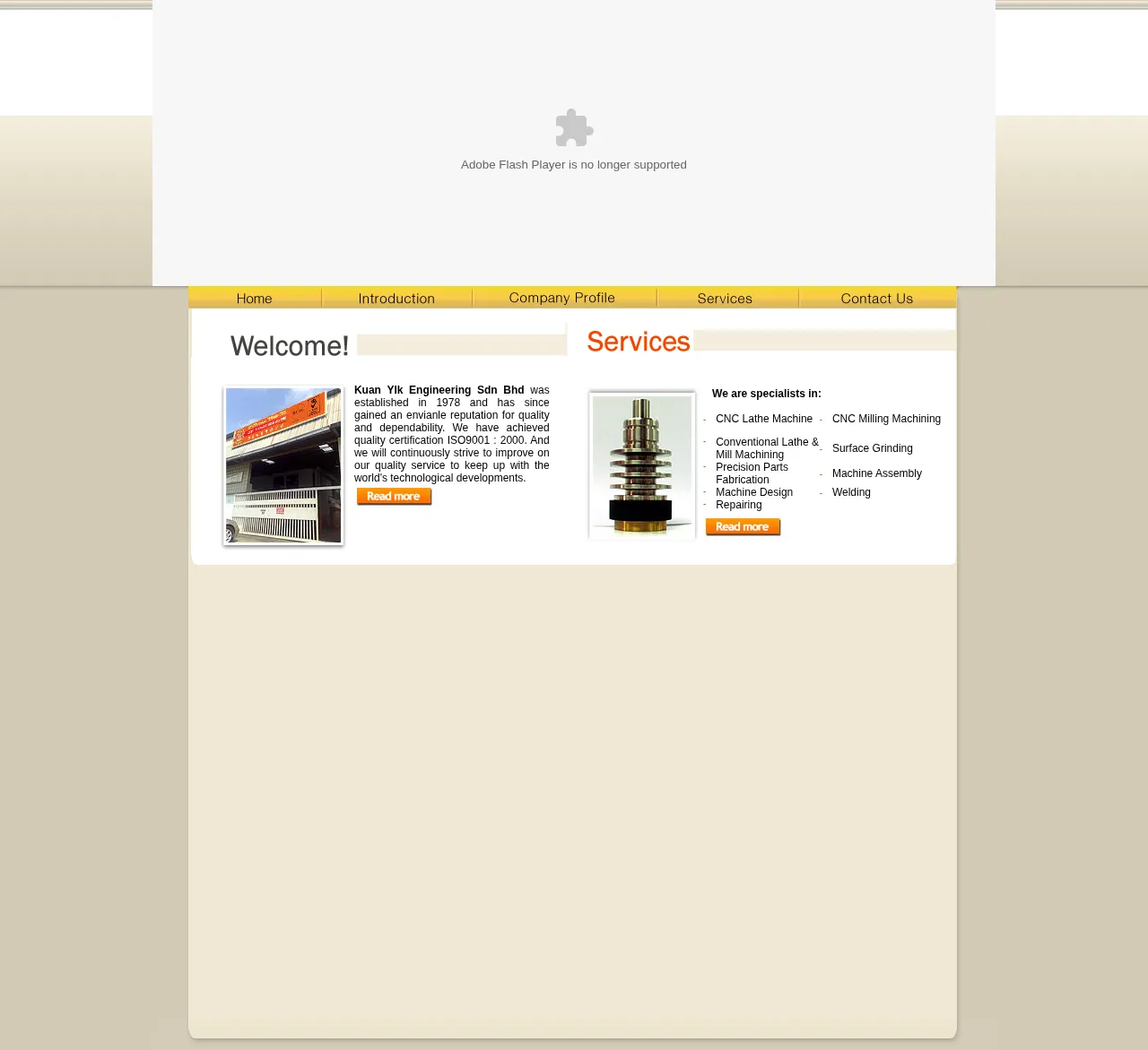 Kuan YIk Engineering Sdn Bhd was established in 1978 and provides precision metalworking, machine fabrication and repair services. The company performs CNC turning and milling, surface grinding, precision parts fabrication, machine design and assembly, welding and equipment repair. It holds ISO9001 : 2000 certification and maintains a focus on quality and continuous improvement.