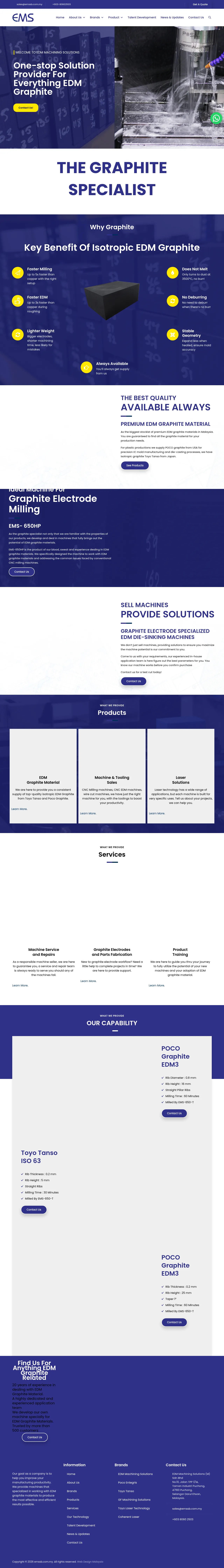 EDM Machining Solutions supplies EDM graphite, machining equipment and related services for toolroom and industrial applications. The company sources isotropic EDM graphite from Toyo Tanso and Poco, fabricates graphite electrodes and parts, and offers CNC milling, EDM and wire-cut machines with associated tooling. It also provides laser system solutions plus machine servicing, repairs, annual calibration and technical support with a stated 24-hour response for product issues.