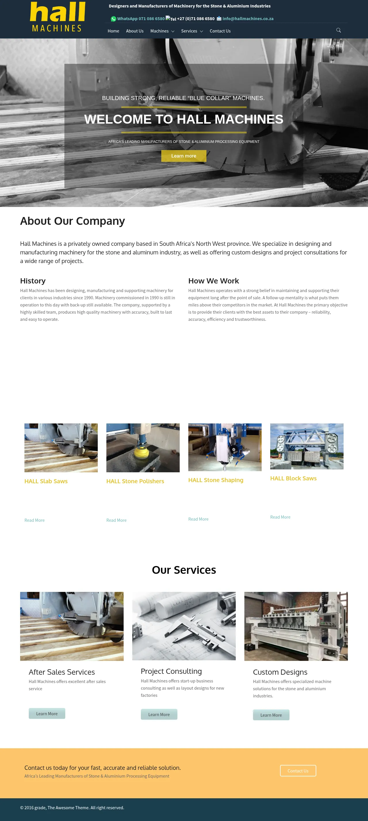 Hall Machines is a privately owned manufacturing company based in the North West province of South Africa. The company specializes in the design and production of heavy-duty machinery for the stone and aluminum processing industries, including slab saws, polishers, and CNC machining centers. In addition to hardware manufacturing, they provide custom machine design services and factory layout consultation. They differentiate themselves through a strong commitment to long-term post-sale technical support and equipment maintenance. Their machinery is widely utilized across Southern Africa for applications ranging from kitchen countertop fabrication to tombstone production.