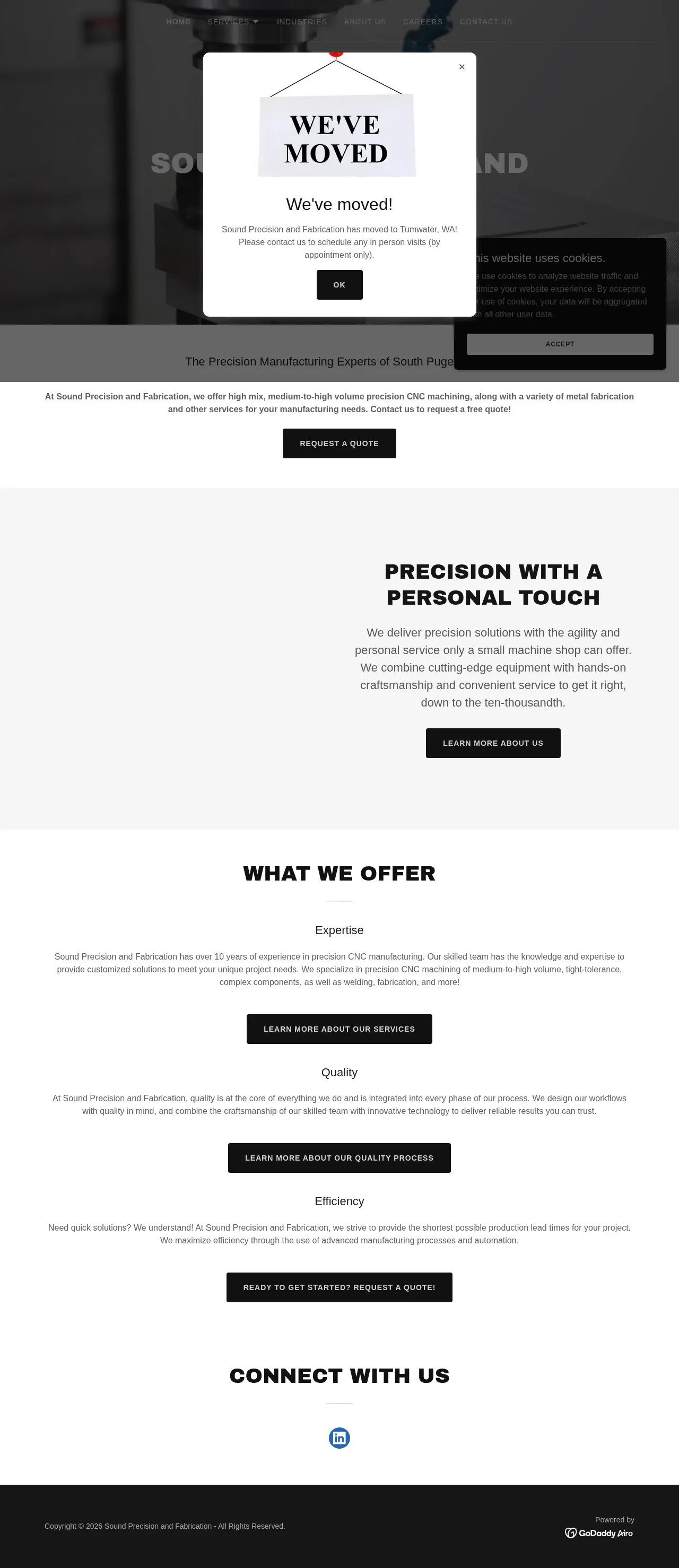 Sound Precision and Fabrication is a contract manufacturing firm specializing in high-mix, medium-to-high volume precision CNC machining. The company serves a diverse range of industrial sectors by providing complex, tight-tolerance component manufacturing, metal fabrication, and welding services. With over a decade of experience, the business emphasizes lean production workflows to achieve shortened lead times through advanced automation. Their facility utilizes a blend of modern manufacturing technology and traditional craftsmanship to ensure quality across every production phase. The company operates out of Tumwater, Washington, and emphasizes a personalized, agile approach to customer project requirements.