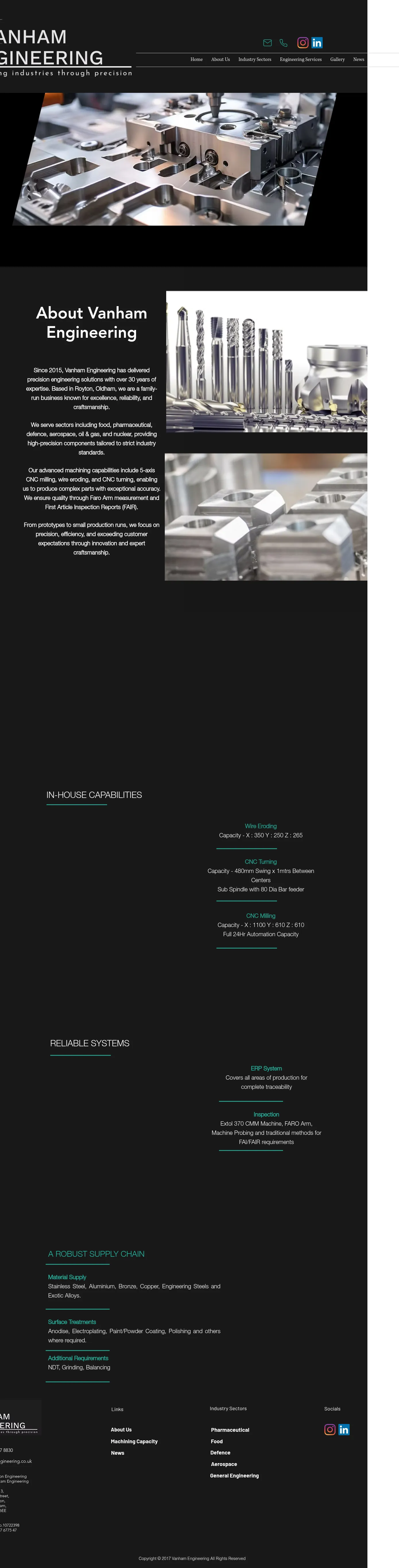 Vanham Engineering is a family-run precision engineering firm established in 2015 with over 30 years of industry experience. Based in Royton, Oldham, the company specializes in bespoke manufacturing, CNC machining, and prototype development for the food, defense, aerospace, and pharmaceutical sectors. Their technical capabilities include 5-axis CNC milling, wire eroding, and CNC turning, supported by advanced inspection processes like Faro Arm measurement. The business is committed to delivering high-precision components that meet rigorous regulatory and safety standards. Through a combination of state-of-the-art machinery and skilled craftsmanship, Vanham Engineering provides comprehensive manufacturing support from initial design concept to final production.