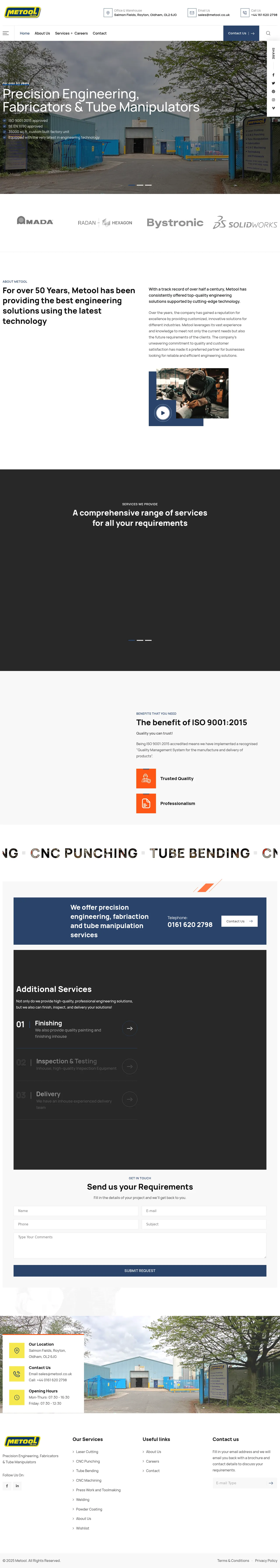Metool is a precision engineering company based in Oldham, UK, with over 50 years of industry experience operating from a 35,000 square-foot facility. The company provides a comprehensive suite of subcontract services, including fabrication, machining, and tube manipulation for a wide range of industrial clients. They maintain an integrated workflow that covers the entire production process from initial manufacturing to final finishing, inspection, and delivery. Committed to quality management, the firm utilizes modern technology to deliver customized engineering solutions. Their service model focuses on building long-term partnerships by meeting both immediate project requirements and future technical needs.