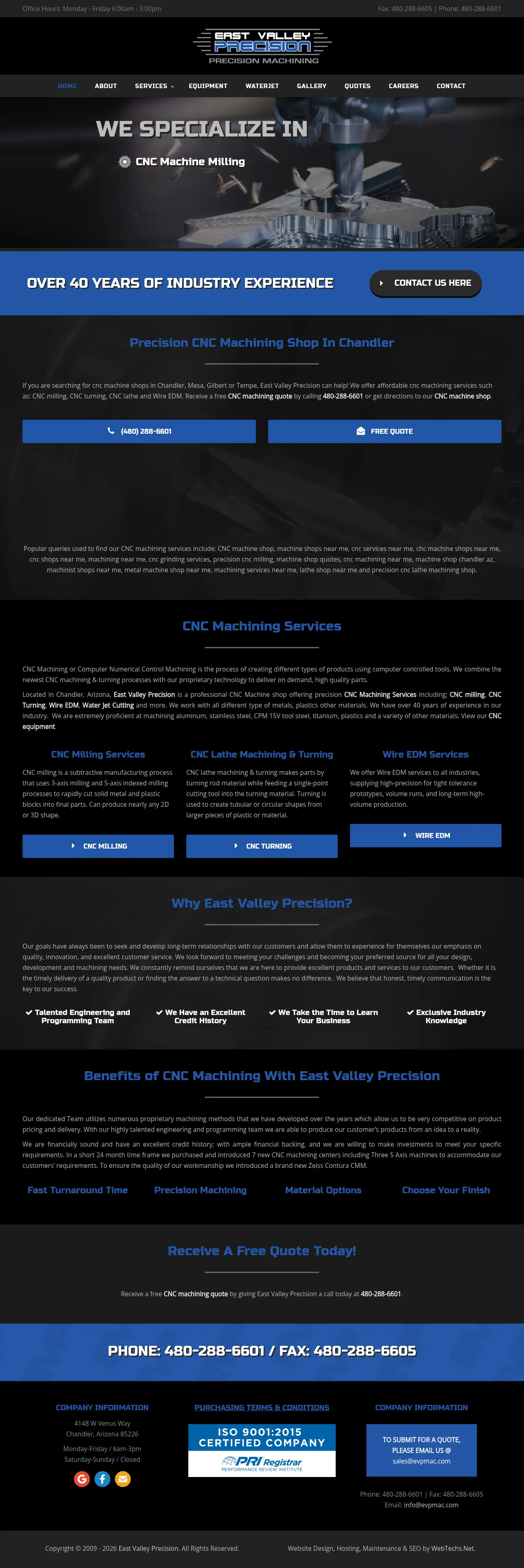 East Valley Precision LLC AZ is a precision machining company based in Chandler, Arizona. The firm provides CNC milling, CNC lathe turning, wire EDM, and waterjet cutting services. It produces machined components to customer specifications and drawings for industrial and manufacturing applications.