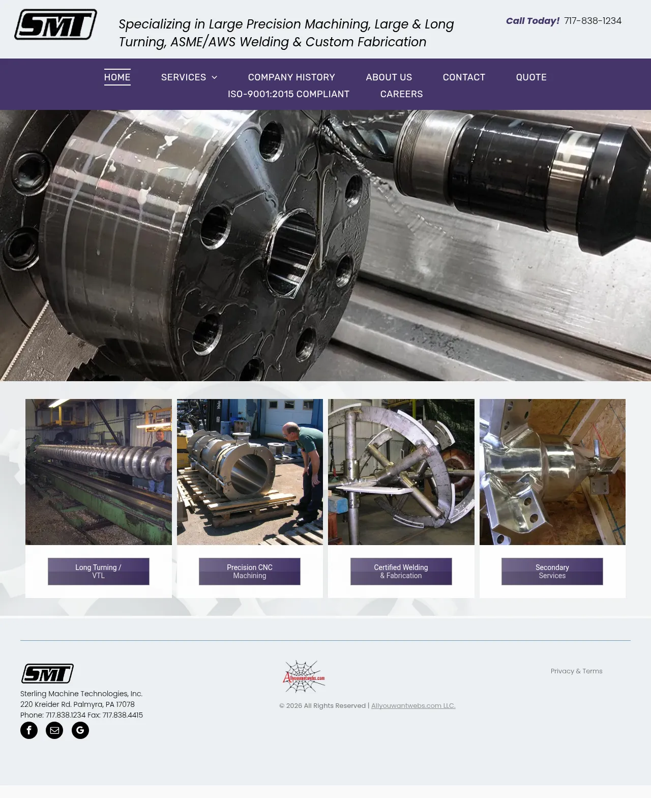 Sterling Machine Technologies, Inc. is a precision manufacturing facility based in Palmyra, Pennsylvania, specializing in large-part CNC machining and turning. The company provides a range of manufacturing services including complex assembly, multi-axis machining, and various welding processes to support industrial requirements. They emphasize quality management through an ISO 9001:2015 compliant framework, serving diverse sectors that require high-precision components and repair parts. The shop features significant infrastructure for large-scale production, including horizontal and vertical machining centers capable of handling oversized diameters and lengths. Beyond core machining, they offer secondary services such as sandblasting, pressure testing, and primer application to deliver comprehensive project solutions.
