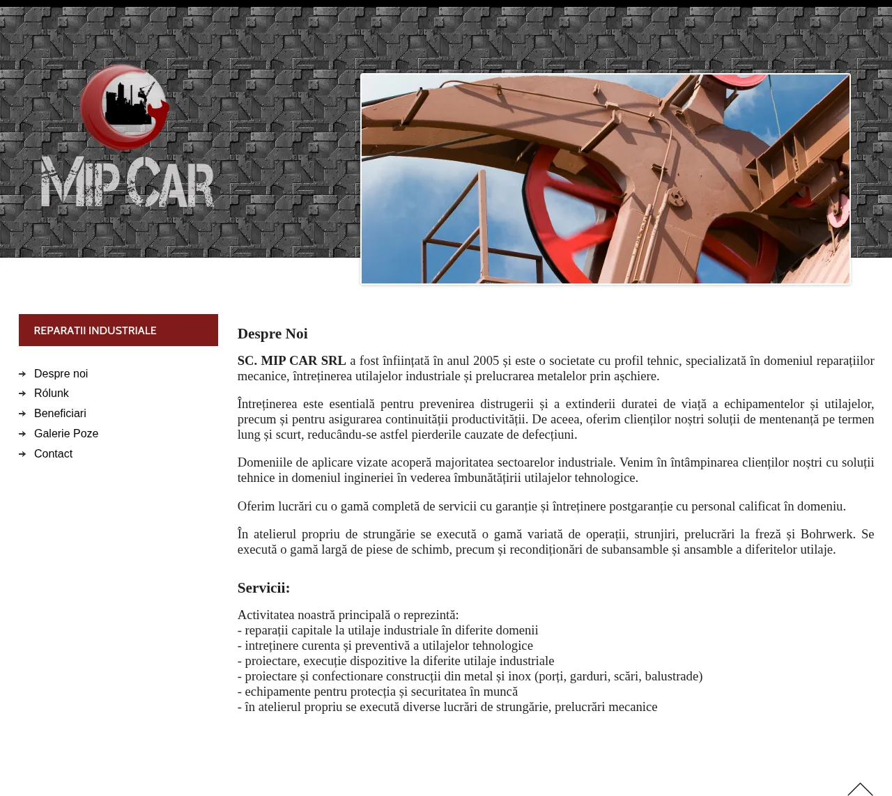 MIP CAR SRL is an industrial services provider established in 2005 specializing in the maintenance and repair of industrial machinery and equipment. The company offers both short-term and long-term maintenance solutions designed to maximize equipment lifespan and ensure operational continuity across diverse industrial sectors. Their technical capabilities include custom engineering, component design, and the fabrication of steel structures. Operating a dedicated metalworking facility, they provide comprehensive machining and repair services to improve technological equipment performance. All services are supported by qualified personnel and include a workmanship warranty for both installation and post-warranty maintenance.