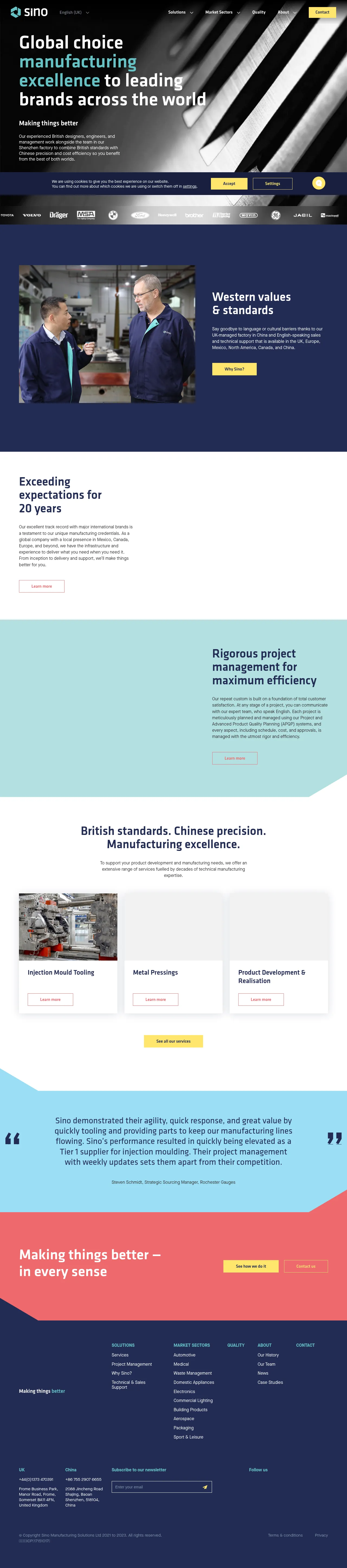 Sino Manufacturing provides end-to-end manufacturing solutions, combining British management and design standards with high-precision production facilities in Shenzhen, China. The company supports a diverse range of industries including automotive, aerospace, medical, and electronics. Their core capabilities include injection mould tooling, metal pressing, die casting, and electro-mechanical assembly. With a global presence across North America, Europe, and Asia, they offer integrated project management, supply chain logistics, and technical support. Their model emphasizes cost-efficient production, agile turnaround, and consistent project oversight for international brands.