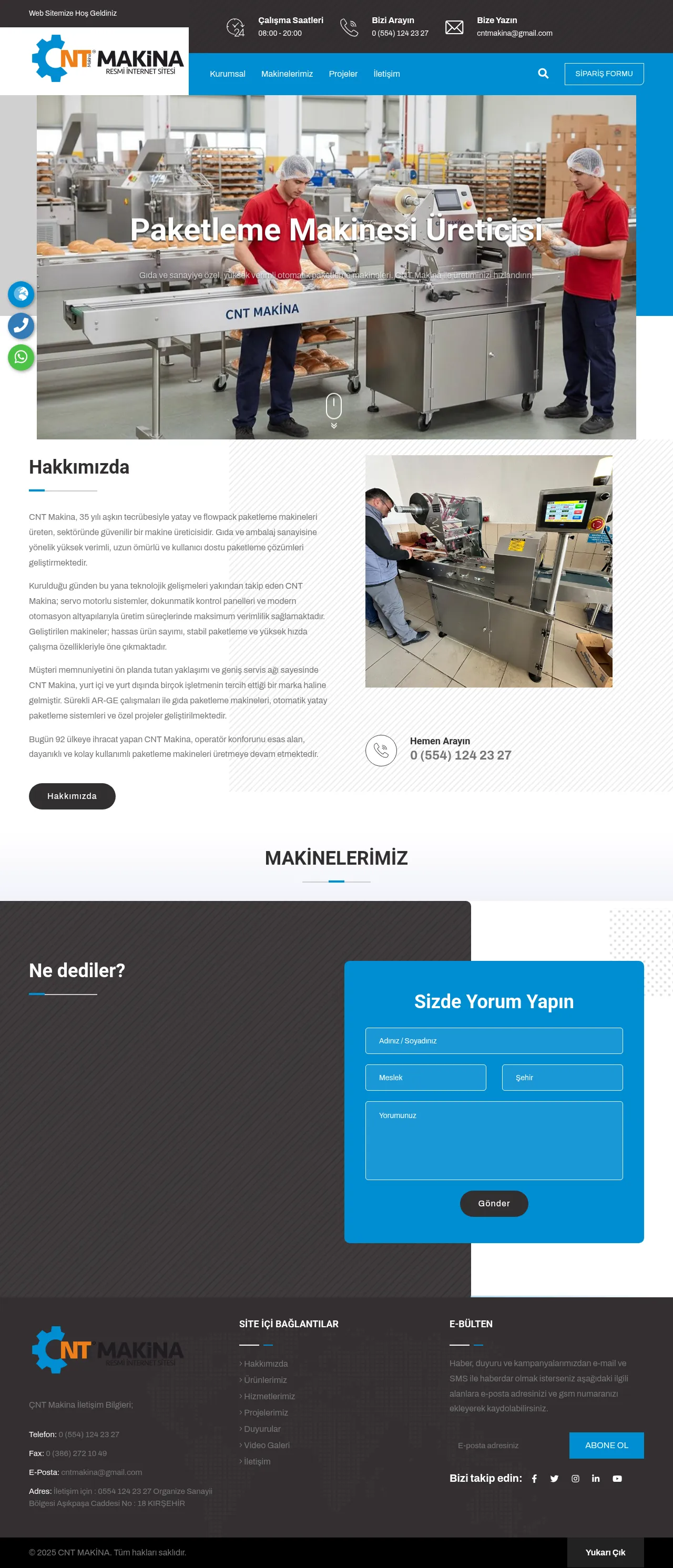 CNT Makina is an industrial manufacturer with over 35 years of experience specializing in the production of horizontal and flowpack packaging machines. The company provides high-efficiency, durable, and user-friendly automation solutions tailored for the food and packaging sectors. Their systems feature advanced servo motor technology and modern control interfaces to ensure high-speed, precise operation for various manufacturing lines. Operating from a global perspective, the company exports to 92 countries and maintains a strong focus on ongoing research and development. Their manufacturing approach emphasizes operator ergonomics and the delivery of reliable, custom-engineered packaging systems to meet specific client needs.