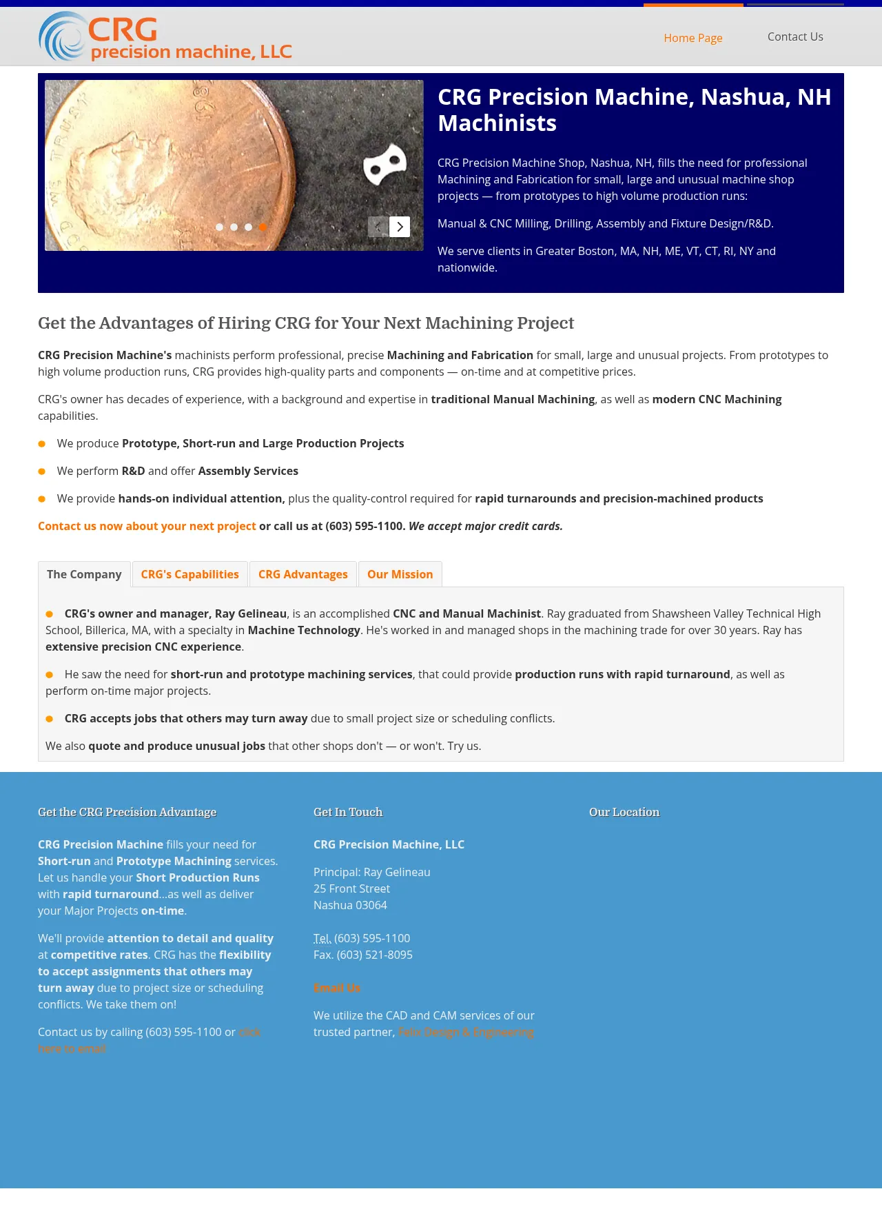 CRG Precision Machine, LLC is a Nashua, New Hampshire-based machine shop specializing in professional machining and fabrication services. The company manages a wide range of projects, from rapid prototyping and short-run production to high-volume manufacturing. Serving clients throughout the United States, they utilize both manual and modern CNC machining techniques to process diverse materials. The facility is recognized for its willingness to handle complex or unusual job requirements that other manufacturers may decline. Dedicated to precision and on-time delivery, CRG provides personalized attention to ensure all parts meet rigorous client specifications.