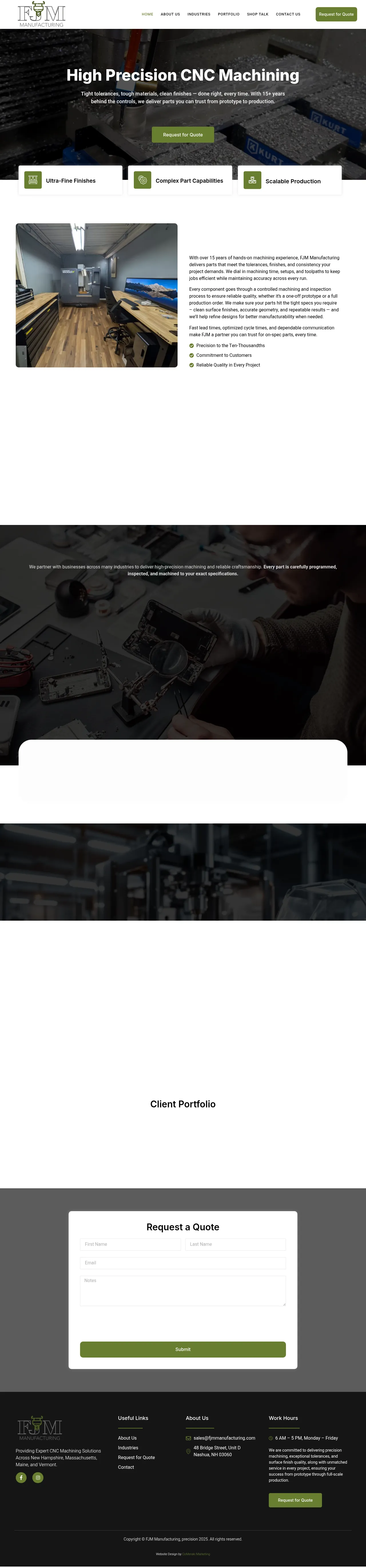 FJM Manufacturing is a precision CNC machine shop specializing in high-tolerance components for medical, aerospace, automotive, electronics, and energy industries. With over 15 years of experience, the company provides end-to-end manufacturing solutions, including design consultation, CAD/CAM programming, and full-scale CNC production. Their technical expertise encompasses intricate geometry, toolpath optimization, and surface finish management. The shop maintains a commitment to quality through controlled machining processes, rigorous inspections, and optimized workholding methods. FJM Manufacturing supports clients from prototype development through to repeatable production runs.