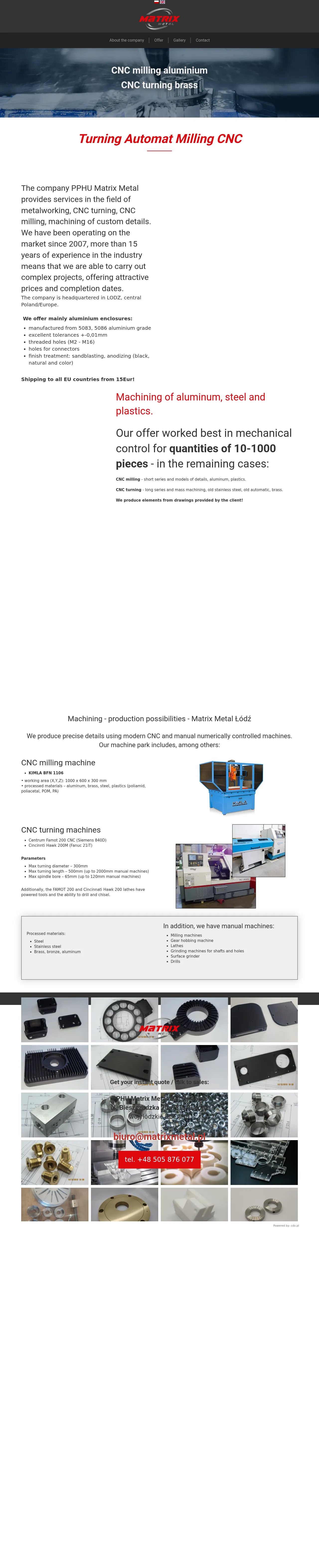 PPHU Matrix Metal is a precision machining company based in Łódź, Poland, specializing in CNC milling and turning services. They provide comprehensive manufacturing solutions including CAD design, prototyping, and serial production of components for international clients across Europe and the USA. The facility is equipped with modern CNC and manual machinery capable of high-precision processing for various industrial applications. Their service offering includes surface finishing treatments like anodizing and sandblasting to provide a complete finished product. The company maintains strict quality control, achieving tolerances of up to ±0.01mm across a diverse range of materials.