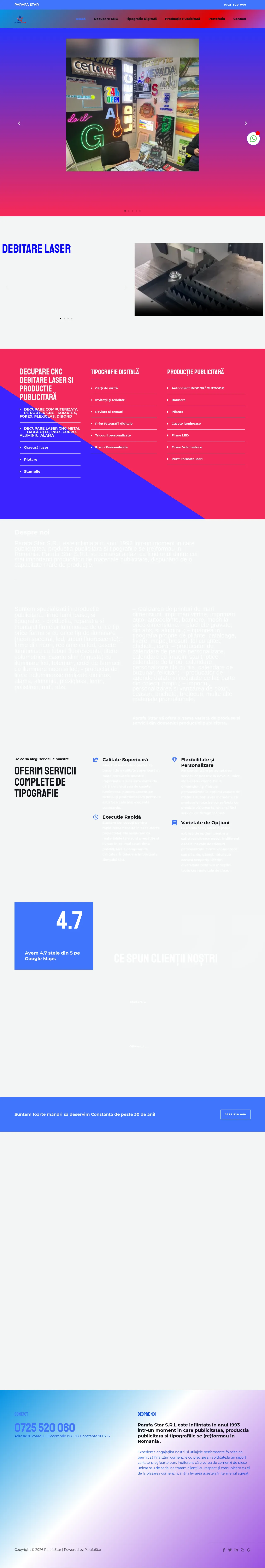 Parafa Star S.R.L is a signage and advertising production company based in Constanța, Romania, operating since 1993. The company provides CNC and laser cutting, laser engraving, digital printing and complete production of advertising materials. They handle one-off pieces and series production and offer CNC programming and design support to meet client specifications.