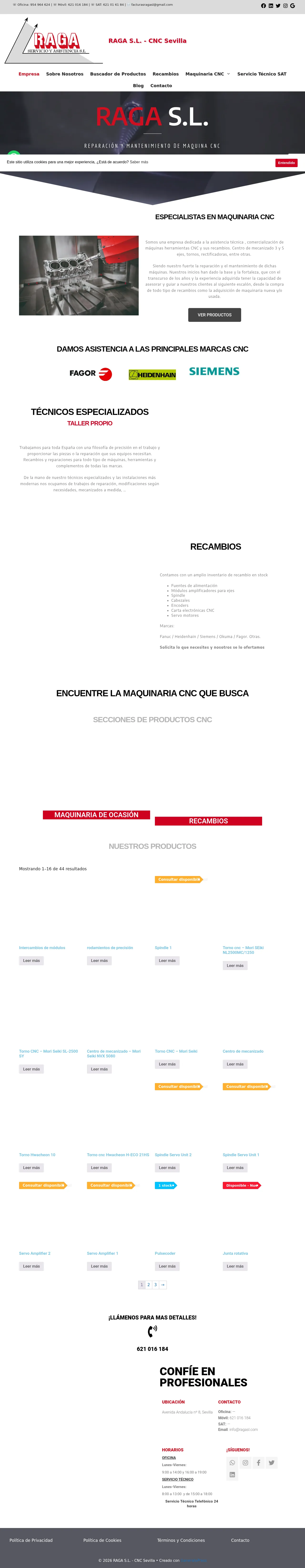 RAGA S.L. is a Seville-based industrial company specializing in the maintenance, repair, and supply of CNC machinery. The firm provides comprehensive technical support across Spain, managing both new and pre-owned equipment for various industrial applications. Their services include expert diagnostic repairs, machine overhauls, and the provision of high-precision spare parts. With a dedicated workshop and a focus on industry-leading CNC brands, they assist clients in optimizing manufacturing performance through tailored technical solutions and supply chain support.
