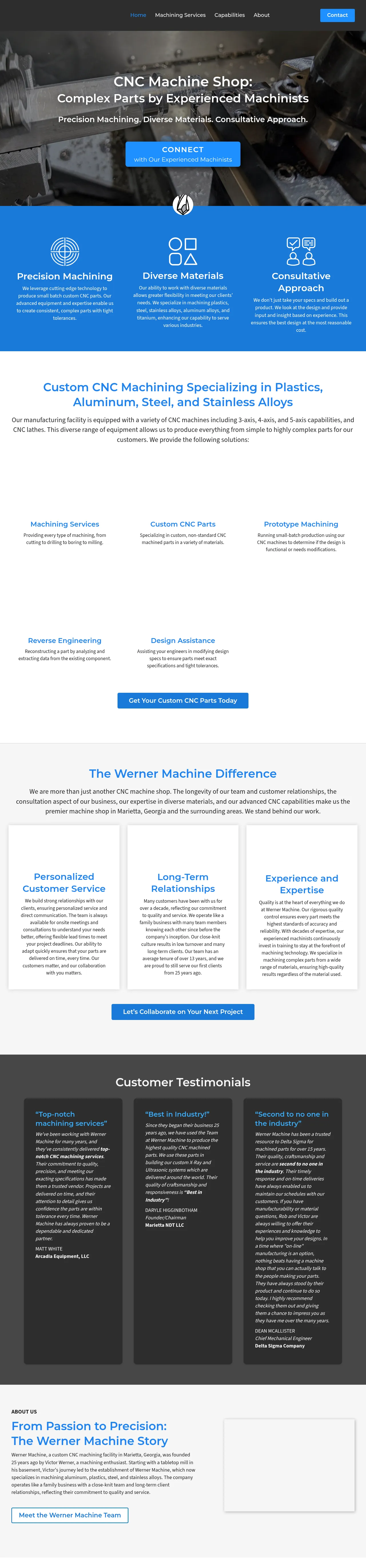 Werner Machine is a custom CNC machining facility based in Marietta, Georgia, specializing in precision milling and turning for a wide range of industries including medical, defense, and industrial automation. The company offers consultative design assistance, prototyping, and small-batch production, utilizing advanced 3, 4, and 5-axis CNC technologies. Known for maintaining long-term client relationships and high-tolerance craftsmanship, they provide custom solutions for complex projects. Their expertise spans diverse materials, supported by an experienced team that emphasizes engineering insights to ensure manufacturability and cost-efficiency. They serve as a comprehensive partner from initial design conceptualization through final production.
