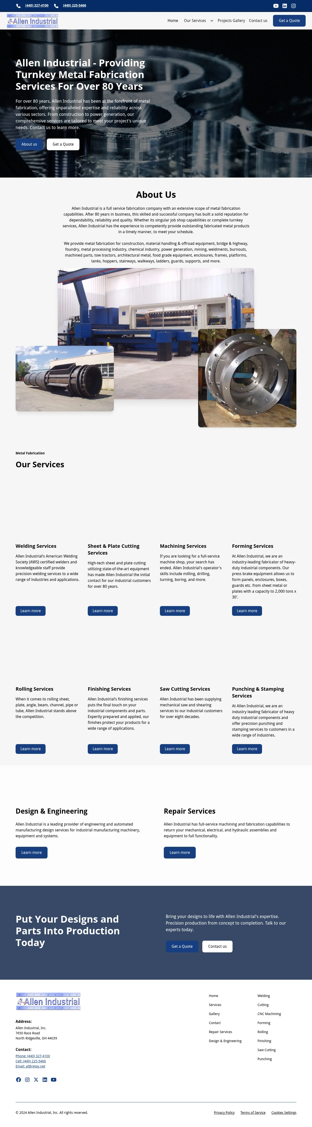 Allen Industrial is a full-service metal fabrication company with over 80 years of experience serving industries such as construction, power generation, mining, and material handling. The company provides a comprehensive suite of services including precision welding, machining, rolling, and custom metal forming. Their capabilities range from high-tech plate cutting and stamping to complex mechanical and hydraulic equipment repair. Utilizing both manual and robotic welding systems, they handle projects from small sheet metal components to large-scale structural weldments. Allen Industrial maintains a focus on tight-tolerance production and offers integrated engineering and manufacturing design support.