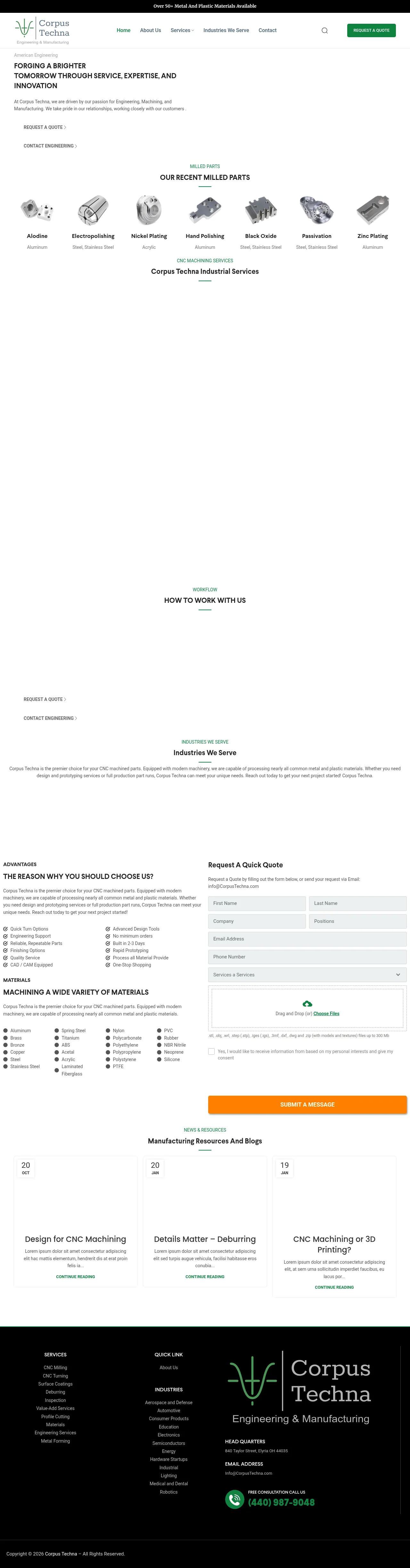 Corpus Techna is a precision engineering and manufacturing firm specializing in CNC machining and production services. The company provides design support, prototyping, and full-scale production runs for a diverse range of industries including aerospace, medical, automotive, and electronics. Their facility is equipped to process an extensive selection of metal and plastic materials. Beyond core machining, they offer value-added services such as material sourcing, deburring, and surface coating to deliver comprehensive manufacturing solutions. Corpus Techna emphasizes a collaborative partnership approach, focusing on quality control and technical expertise to meet demanding project specifications.
